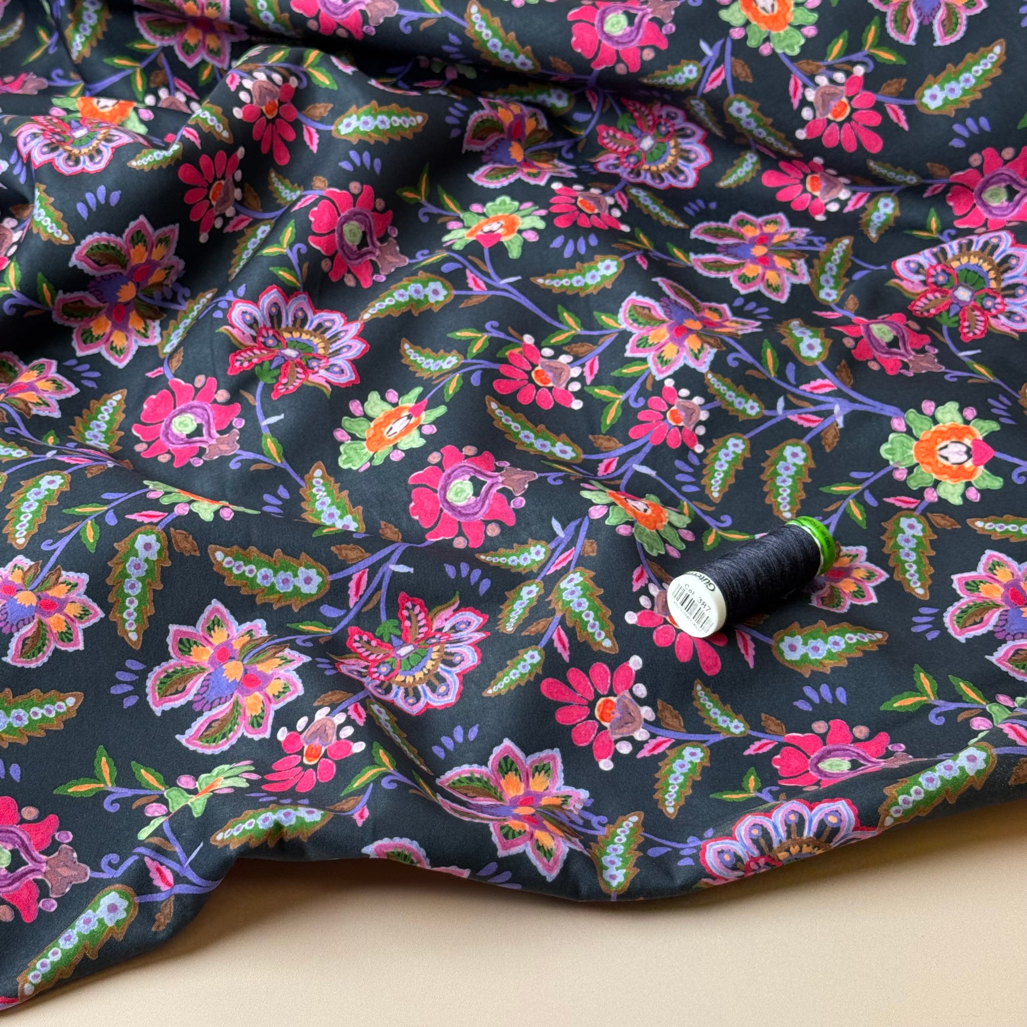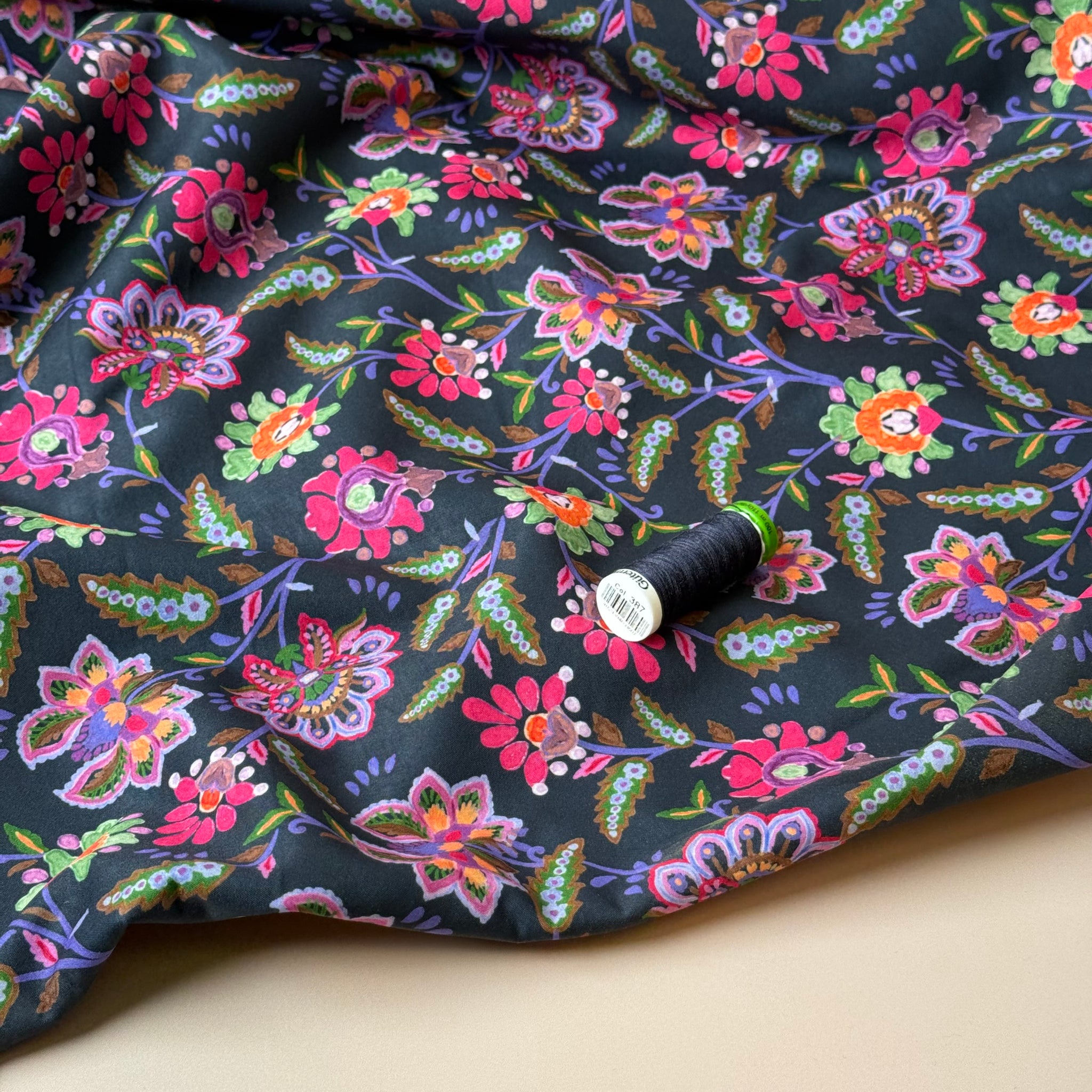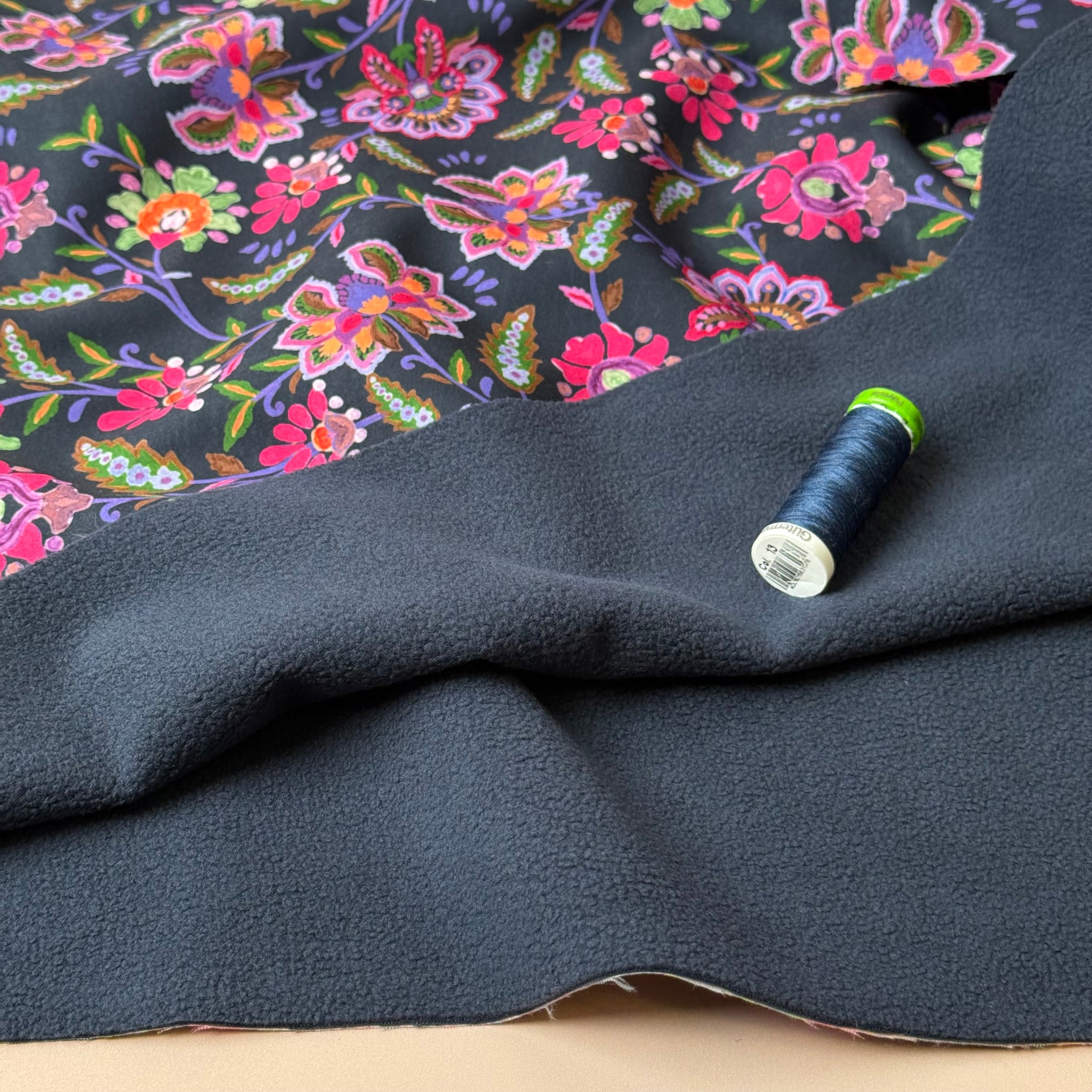 This fabric features vibrant, playful pink, purple, orange and green flowers on a navy background, with fleece backing. The front 'Shell' is a showerproof woven fabric which is backed with a cuddly warm fleece for comfort, perfect for autumn and winter seasons.