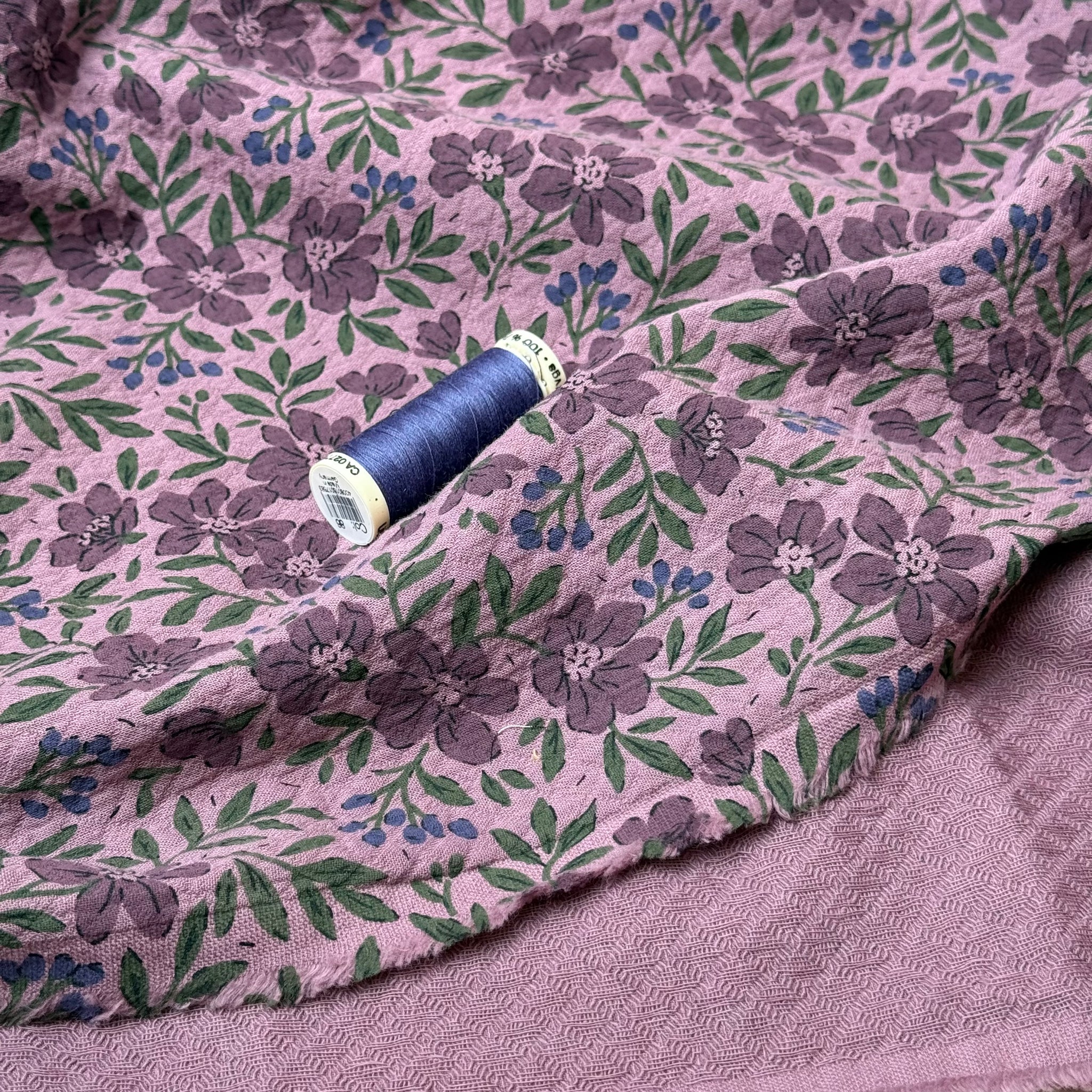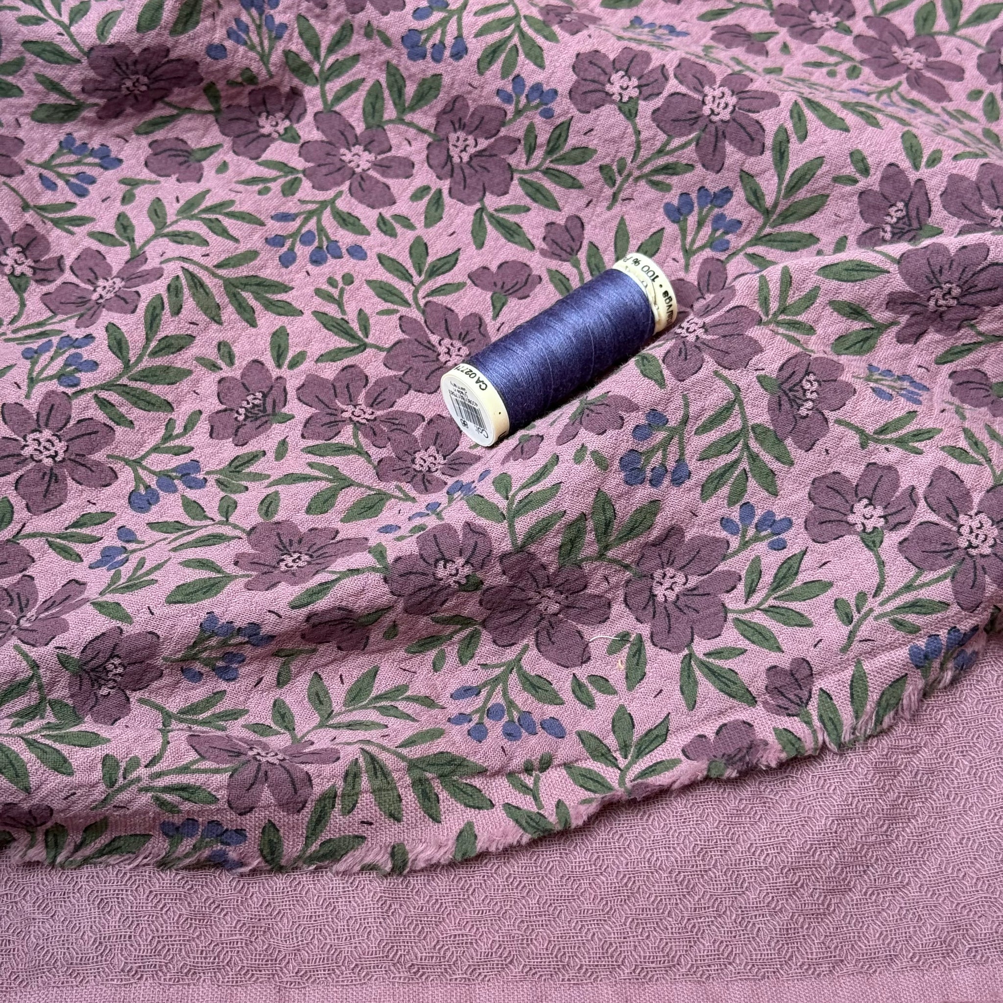 Unique and stunning pure cotton jacquard fabric with small diamond shapes woven into it. The special diamond jacquard weave gives this fabric a lovely structure, ideal for making summer jackets, tops, trousers, shorts and dresses. The fabric is yarn dyed in mauve colour and features flowers in dark mauve and purple printed on it.