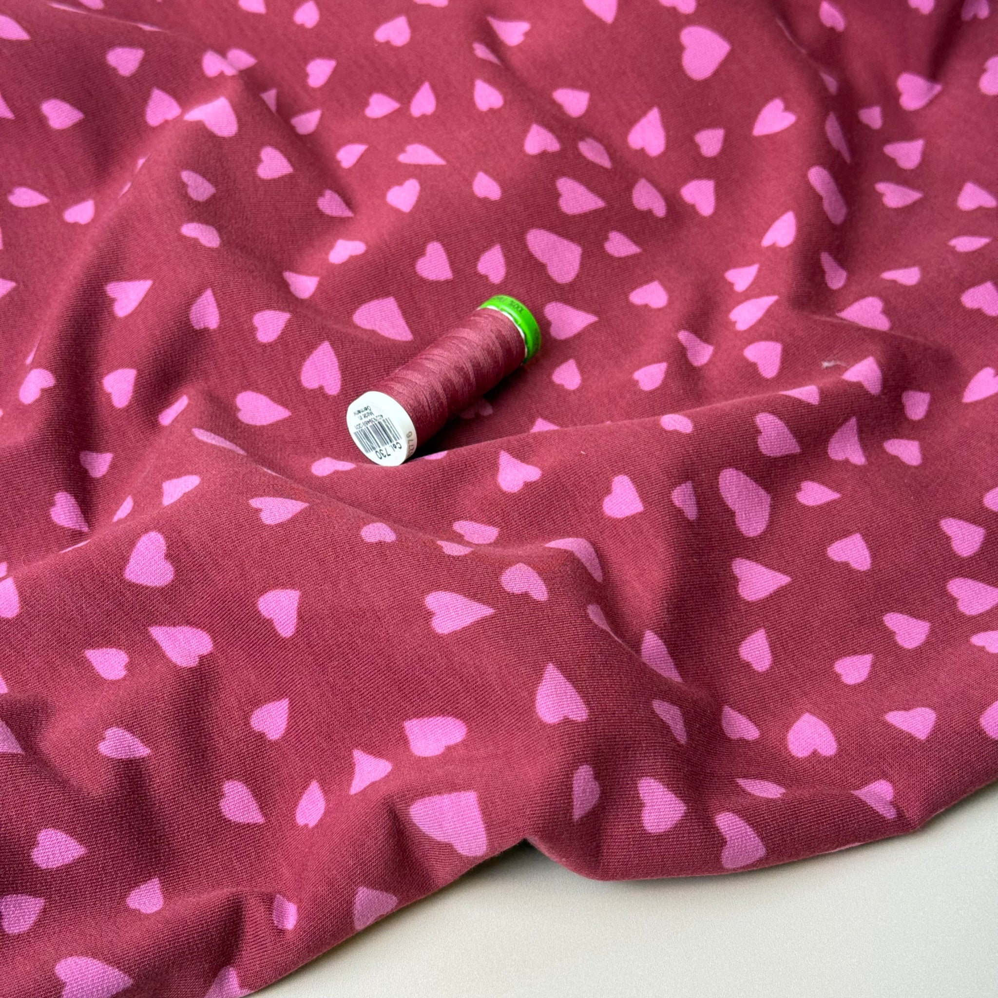 High quality cotton french terry fabric with looped back features pink hearts on a Bordeaux red background. It will make a cosy, comfortable and elegant t-shirts, sweaters, hoodies, sweater dresses and joggers.