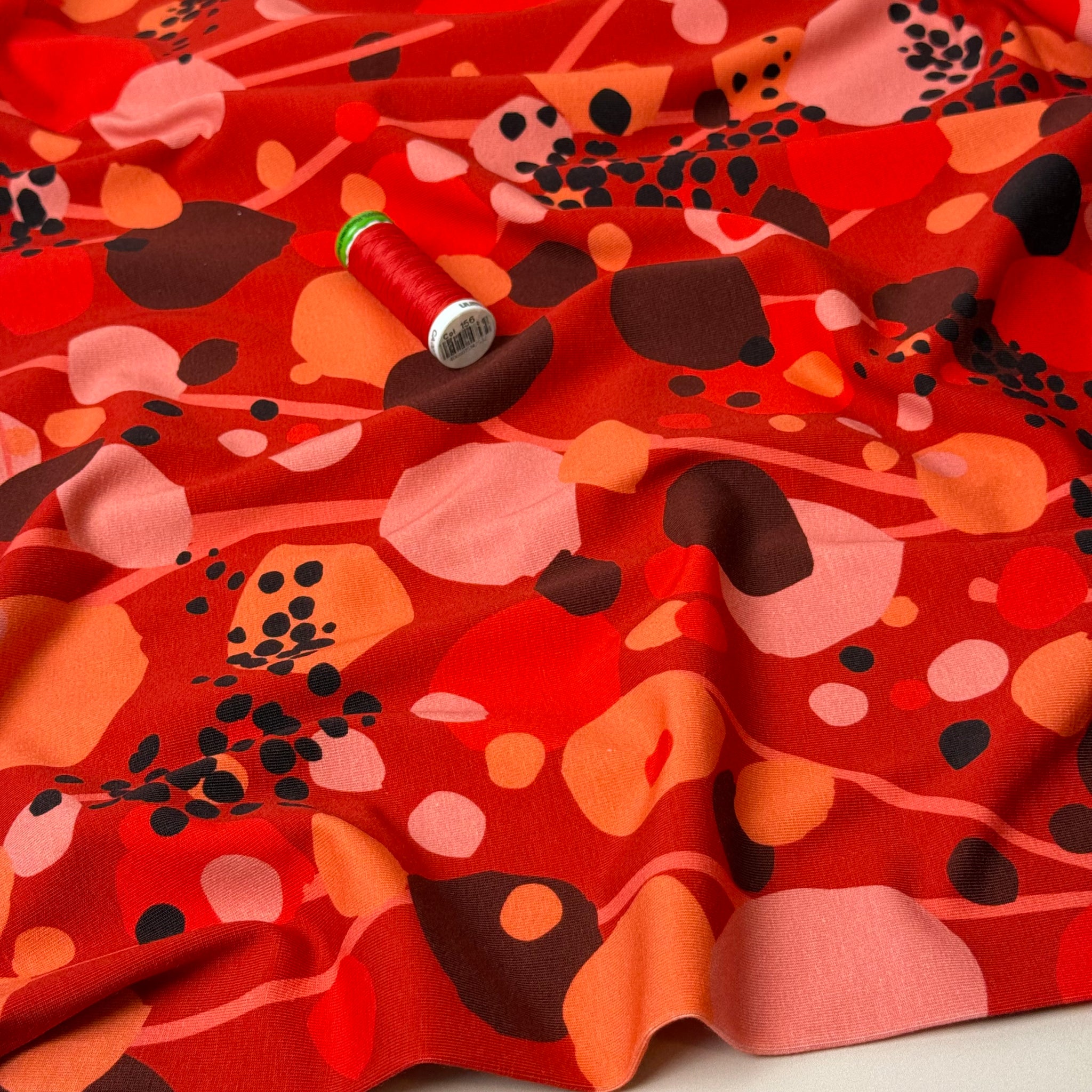 A truly unique and beautiful high quality Oeko-Tex certified cotton jersey from Denmark, featuring abstract, poppies in shades of red and brown, on a red background.
