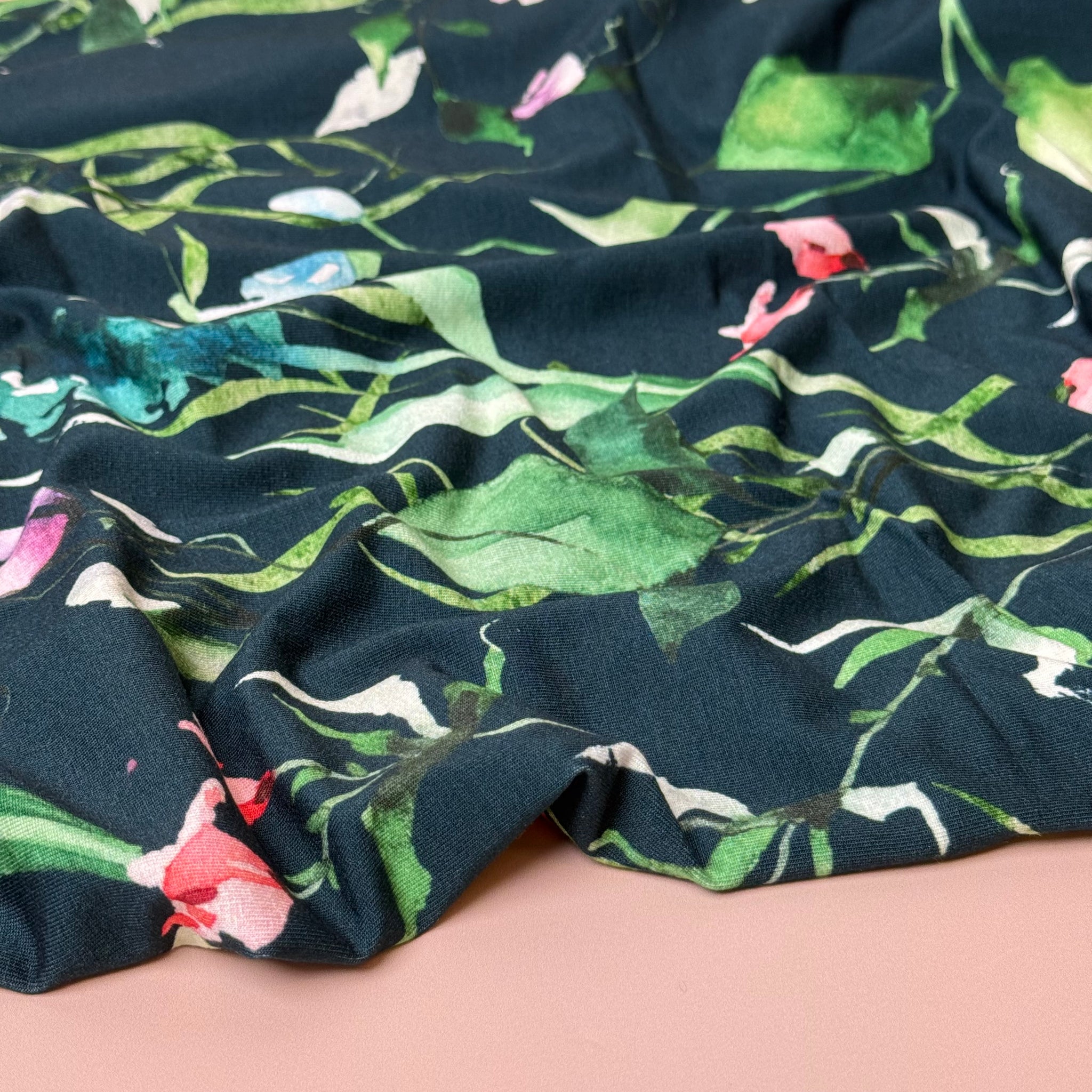 A truly unique and beautiful high quality viscose jersey from Denmark, featuring stunning watercolour flowers and plants design in the shades of green, purple and teal, on a dark navy background.