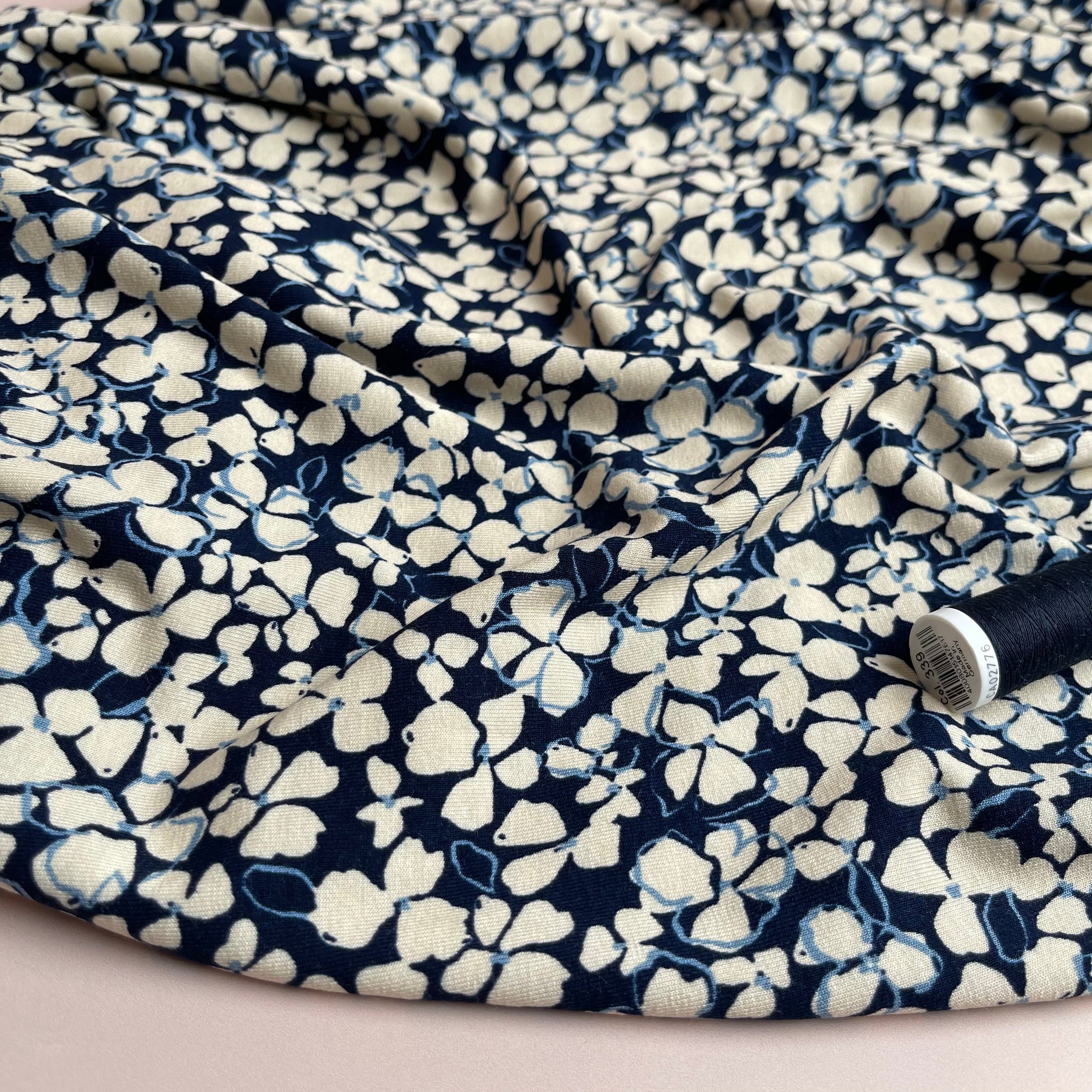 A wonderfully soft and beautiful viscose jersey fabric with ample drape and an off-white floral design on a navy background with blue outlines. This knitted fabric has generous stretch and good recovery, offering beautiful drape and bounce.