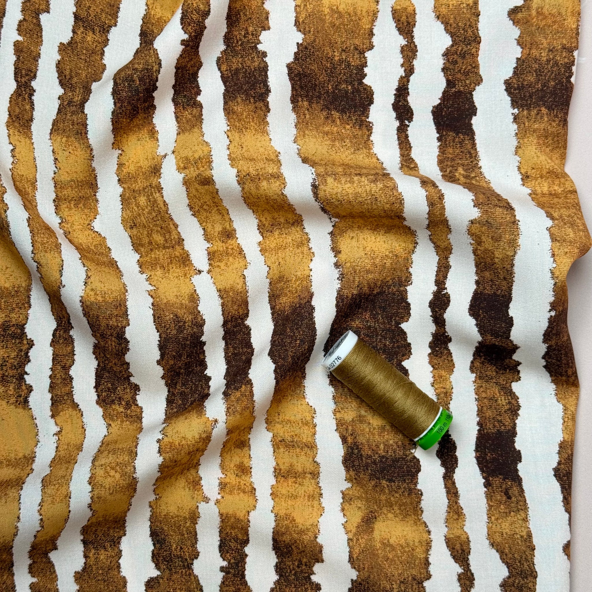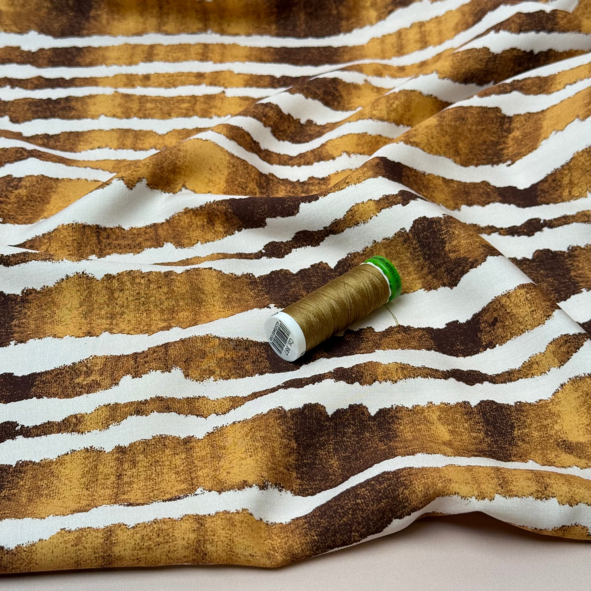 This stunning viscose poplin fabric with a stripe design in autumnal shades of brown and yellow, with a white stripe, perfect for sewing blouses, swooshy dresses and loose trousers that can be worn all year round.