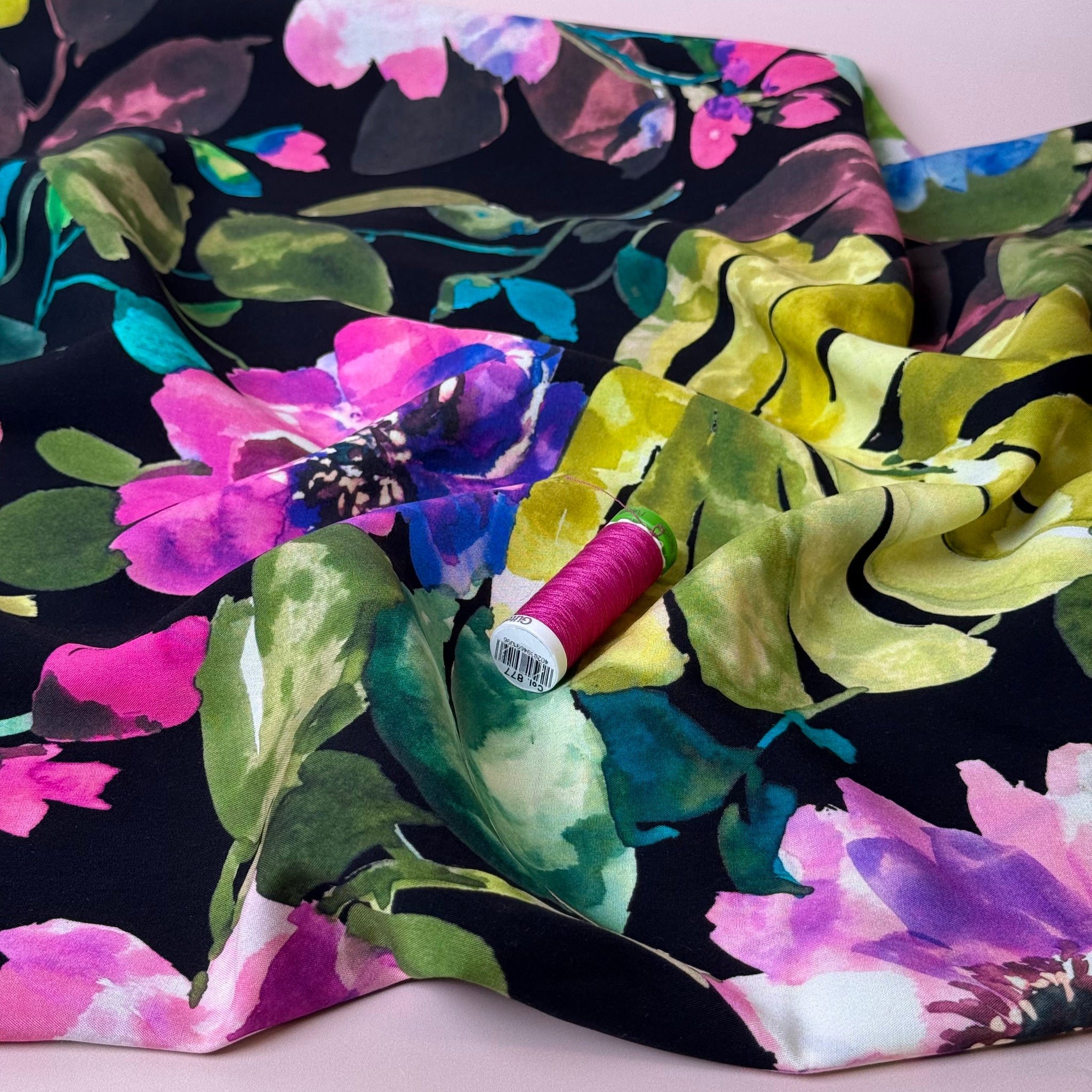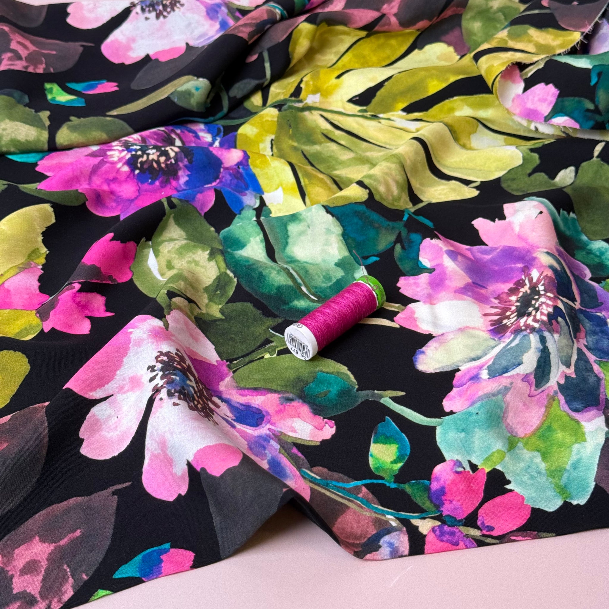 This elegant high quality viscose fabric features bold and beautiful painterly flowers in jewel tones on a black background. It is lightweight and has the most pleasant handle, with silky soft hand finish and beautiful drape.