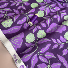 This mid-weight cotton canvas has a soft hand and features a vine and berry design in shades of purple and green on a dark purple background.
