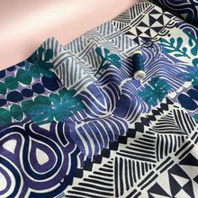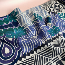 This mid-weight cotton canvas has a soft hand and features a graphic design in an aztec style in teal, blue and navy on an off-white background.