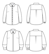 Reclaim the button-up with the Vernon Shirt! This boob-friendly take on the essential button-up shirt features two views: View A is a classic shirt with a traditional collar and collar stand, and full sleeves with narrow cuffs. View B is a fashion-forward version with a dramatic collar, covered button placket, and lantern sleeves with wide cuffs.