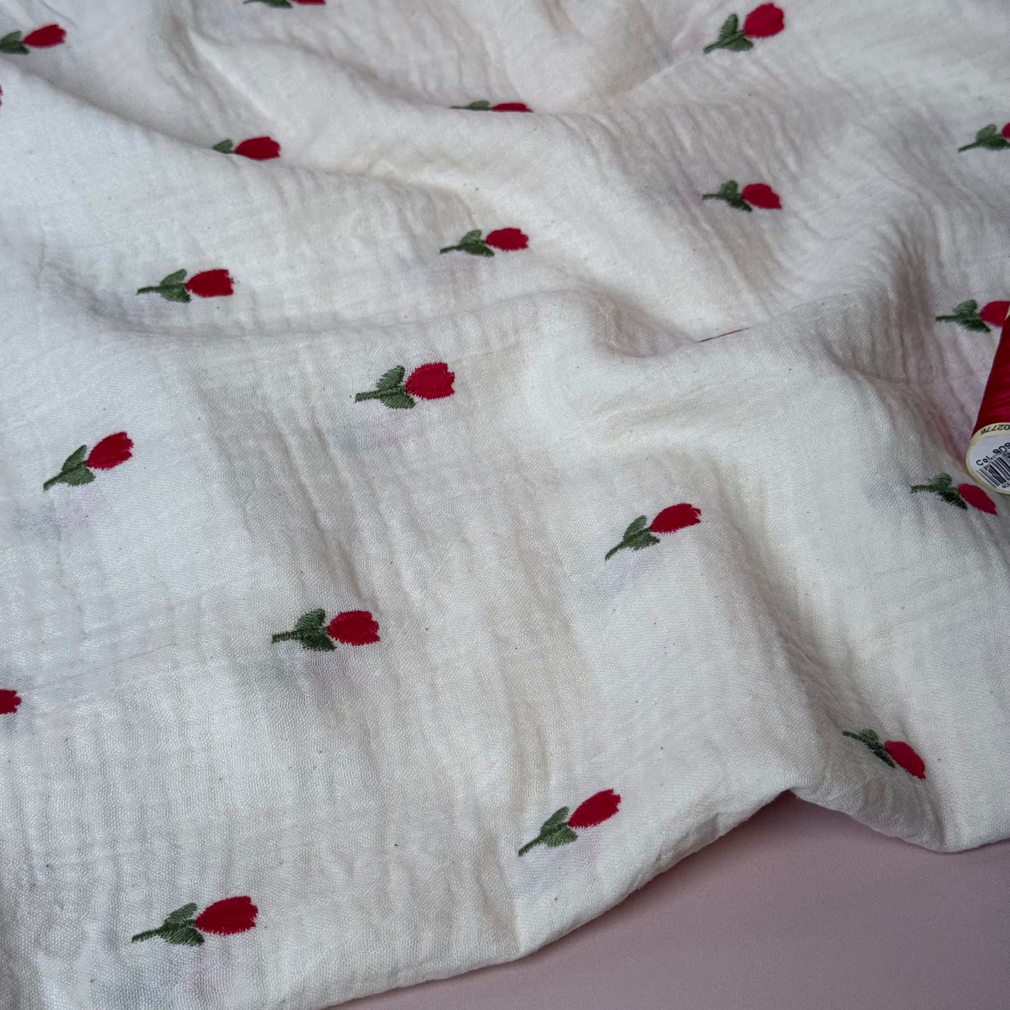 This natural colour double gauze is soft with an embroidered tulip design in red and green. This fabric can be used to make beautiful garments such as tops, dresses, simple blouses, trousers and children's clothes.