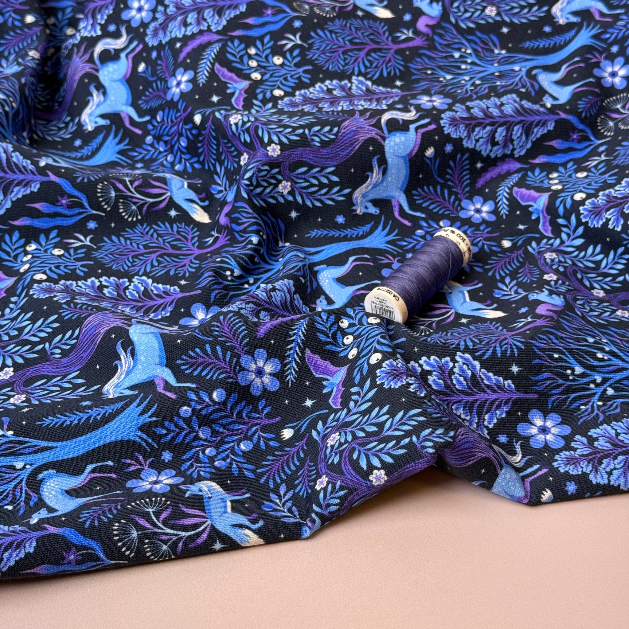 High quality cotton french terry fabric with looped back featuring enchanted Forest design with unicorns and other woodland animals in purple and sky haze blue on a navy background. It will make a cosy, comfortable and elegant t-shirts, sweaters, hoodies, sweater dresses and joggers.