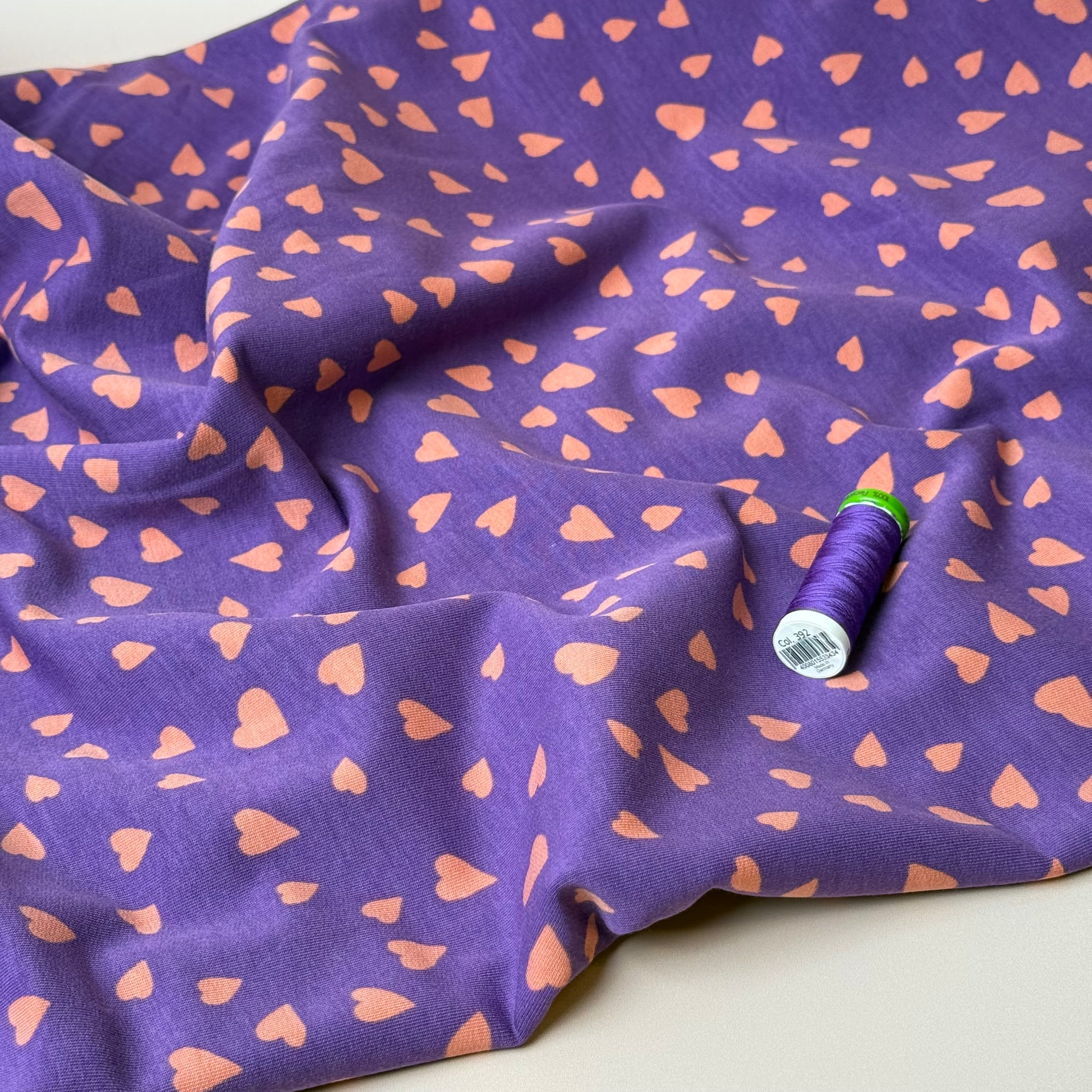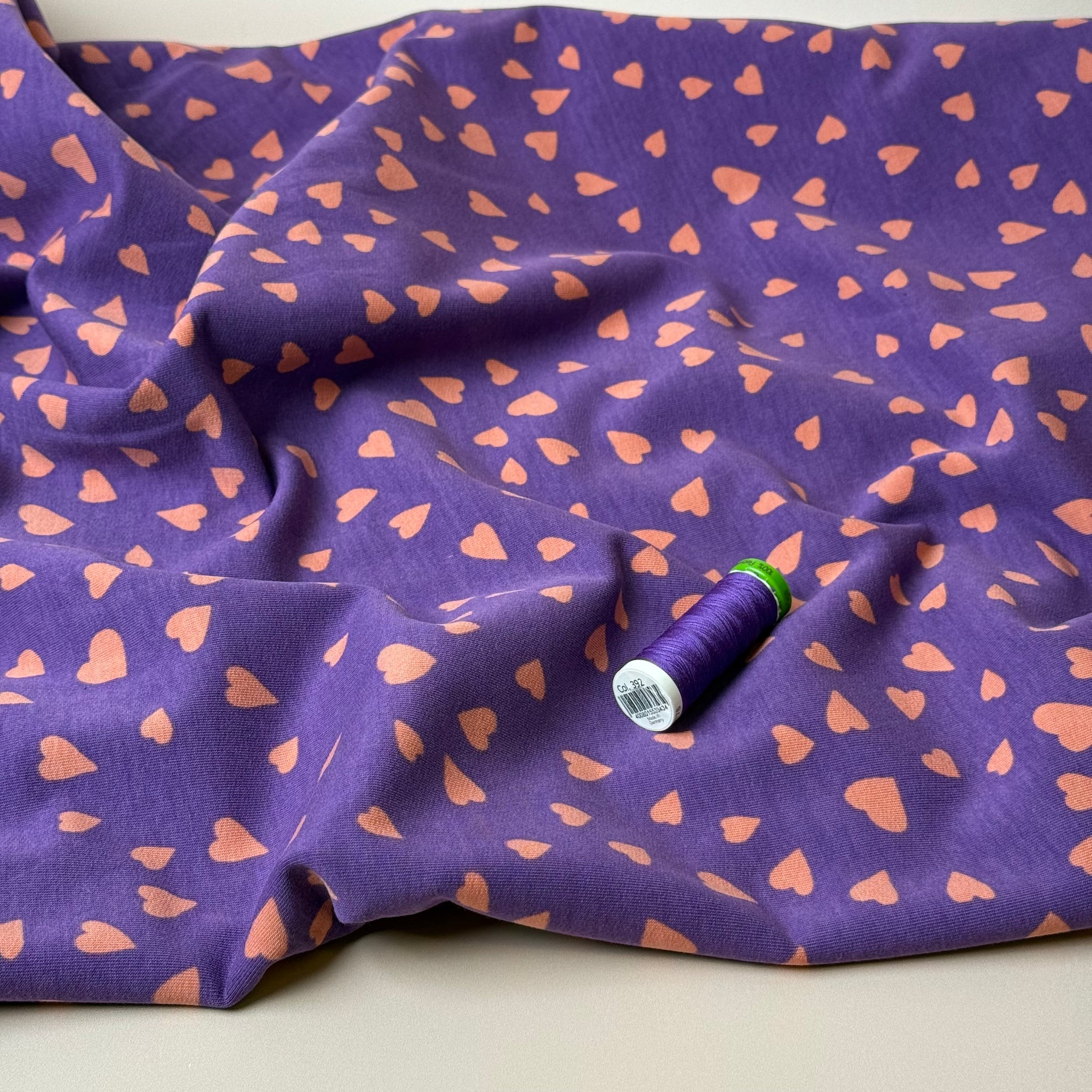 High quality cotton french terry fabric with looped back features coral hearts on a purple background. It will make a cosy, comfortable and elegant t-shirts, sweaters, hoodies, sweater dresses and joggers.