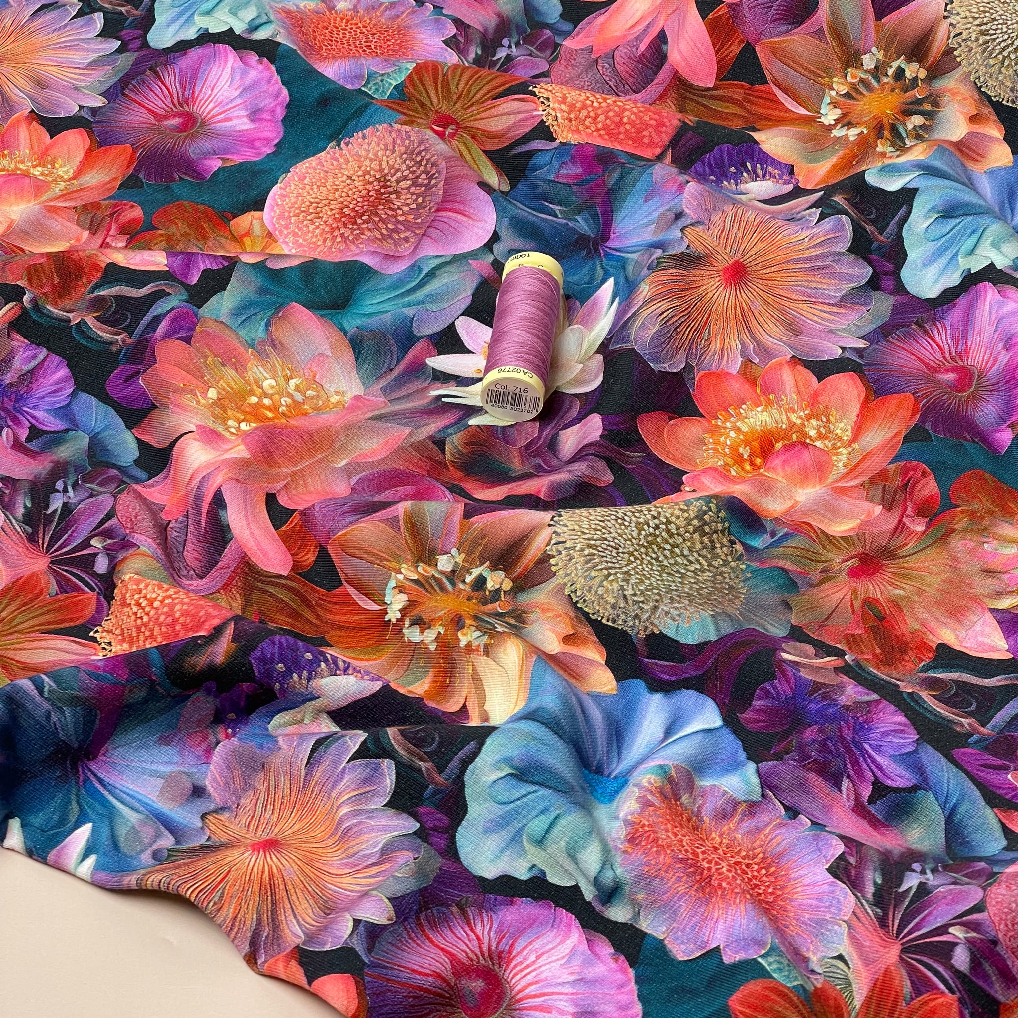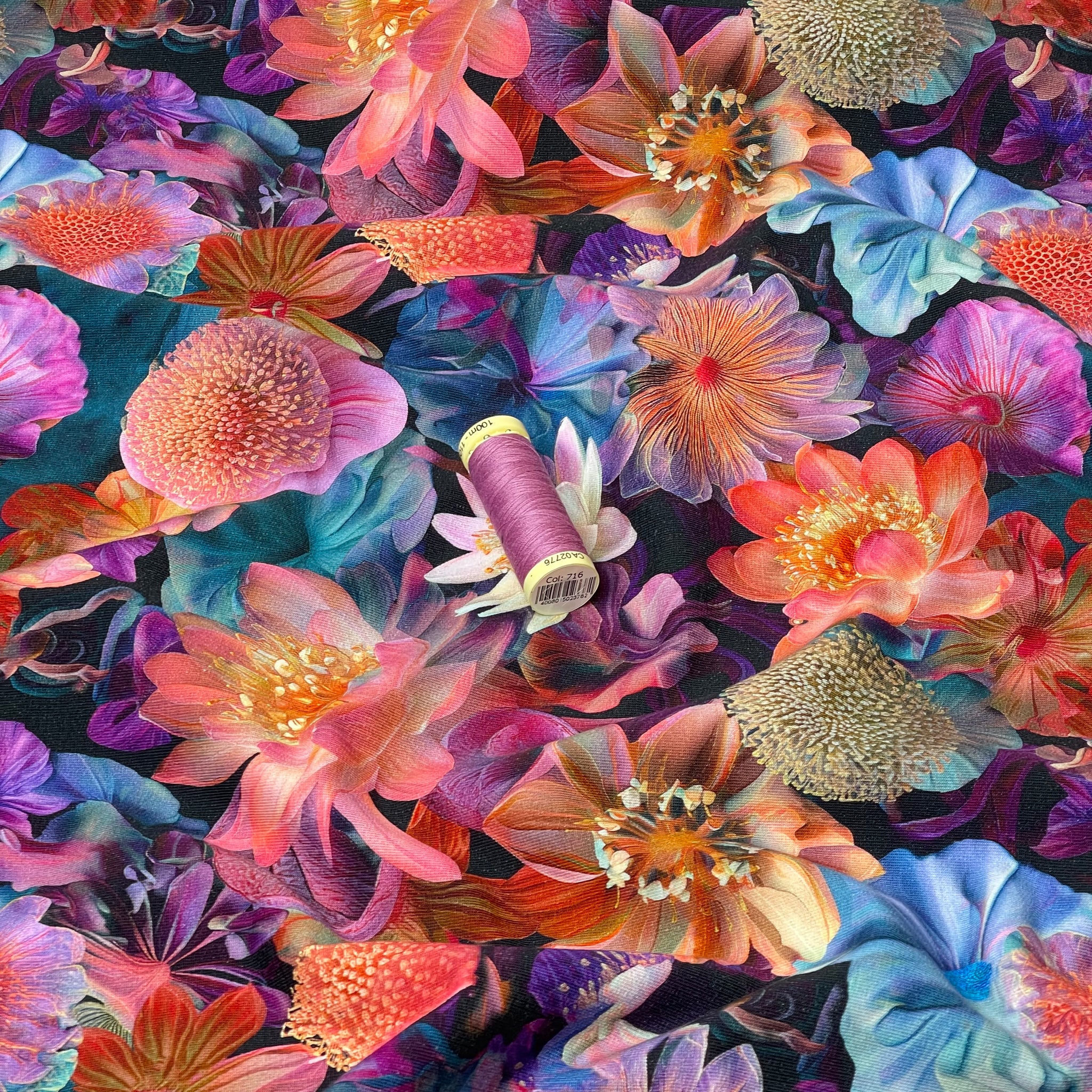 High quality cotton Sweatshirting fabric with cuddly and warm fleecy back. It features three dimensional water flowers and vibrant and beautiful shades. A truly unique and beautiful Sweatshirting.
