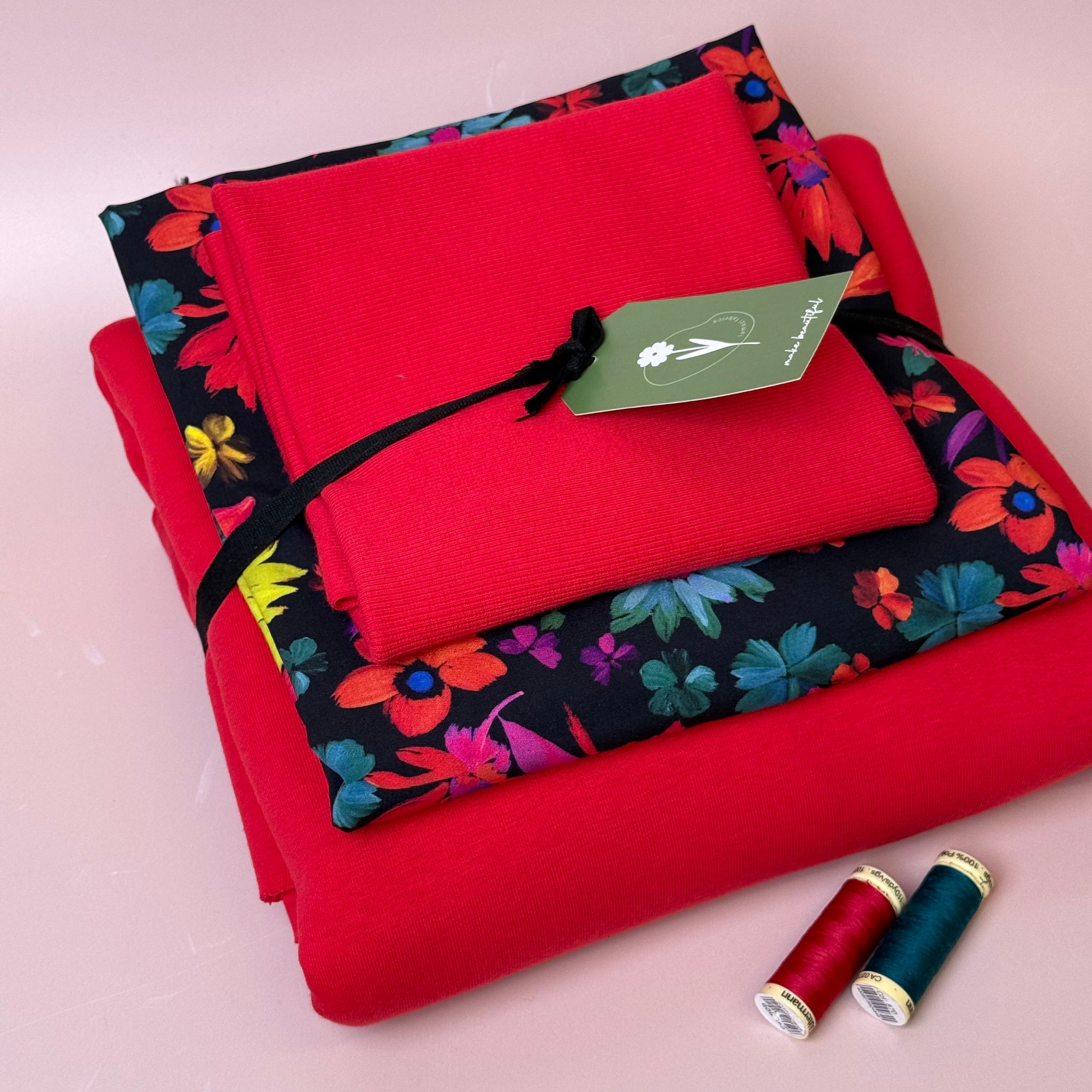 Make an Outfit Colour Bundle - Dopamine Flowers Viscose & Sweatshirting in Red with Ribbing