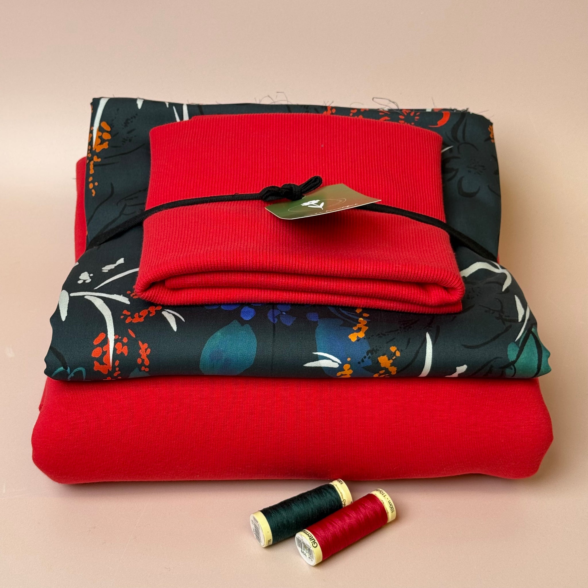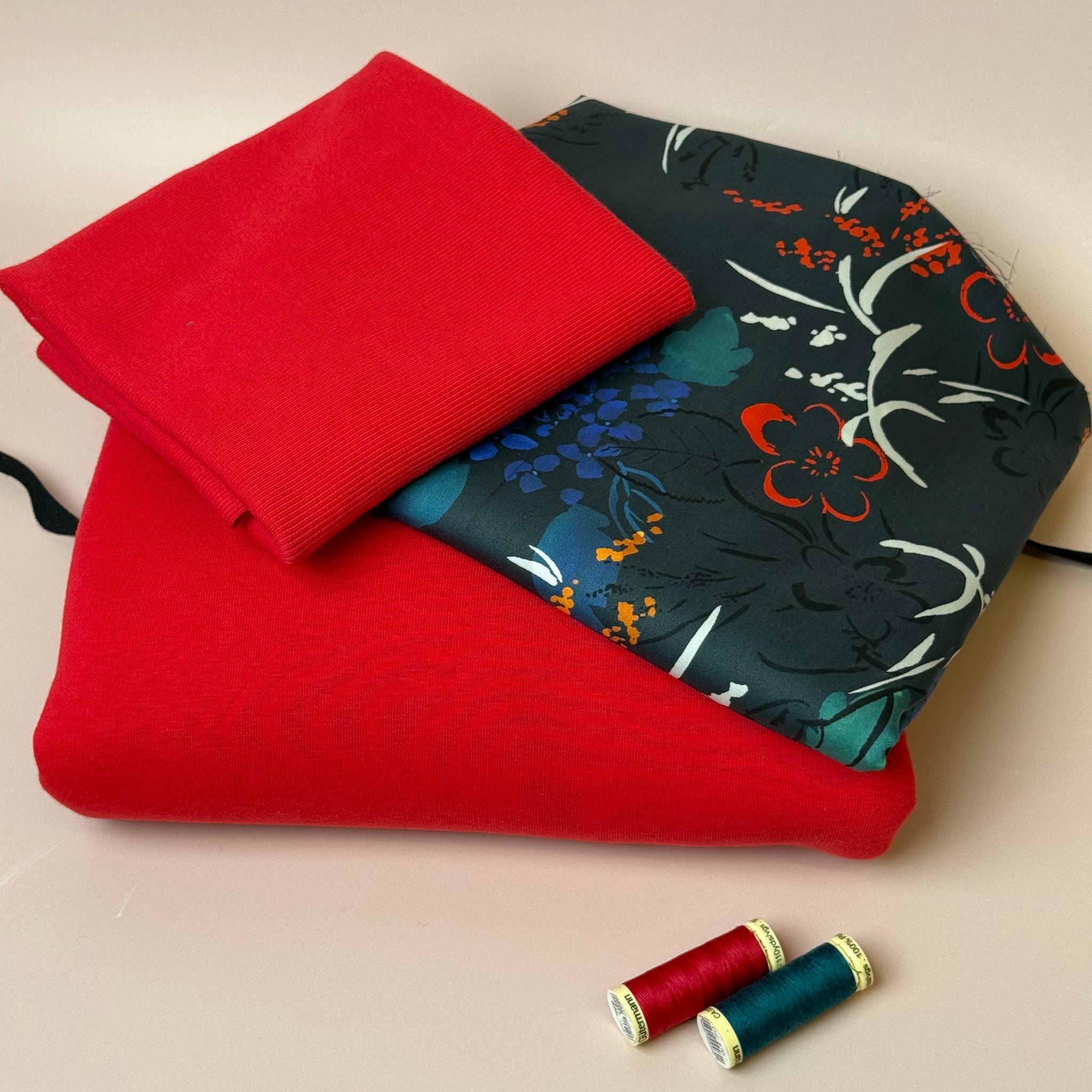 Make an Outfit Colour Bundle - Midnight Blooms Tencel Sateen & Sweatshirting in Red with Ribbing