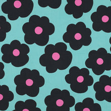 A beautiful and soft, lightweight cotton poplin fabric featuring a large graphic floral design in black and pink on a turquoise background.