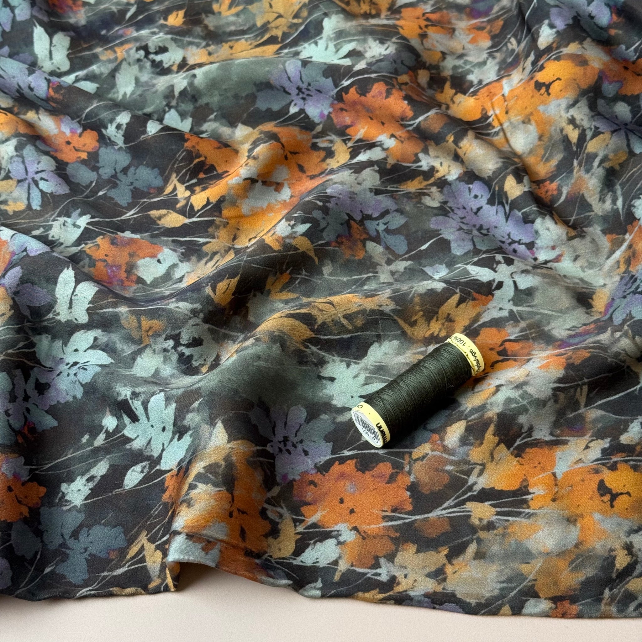 Hazy Autumn Flowers Dark Viscose Sateen Fabric
