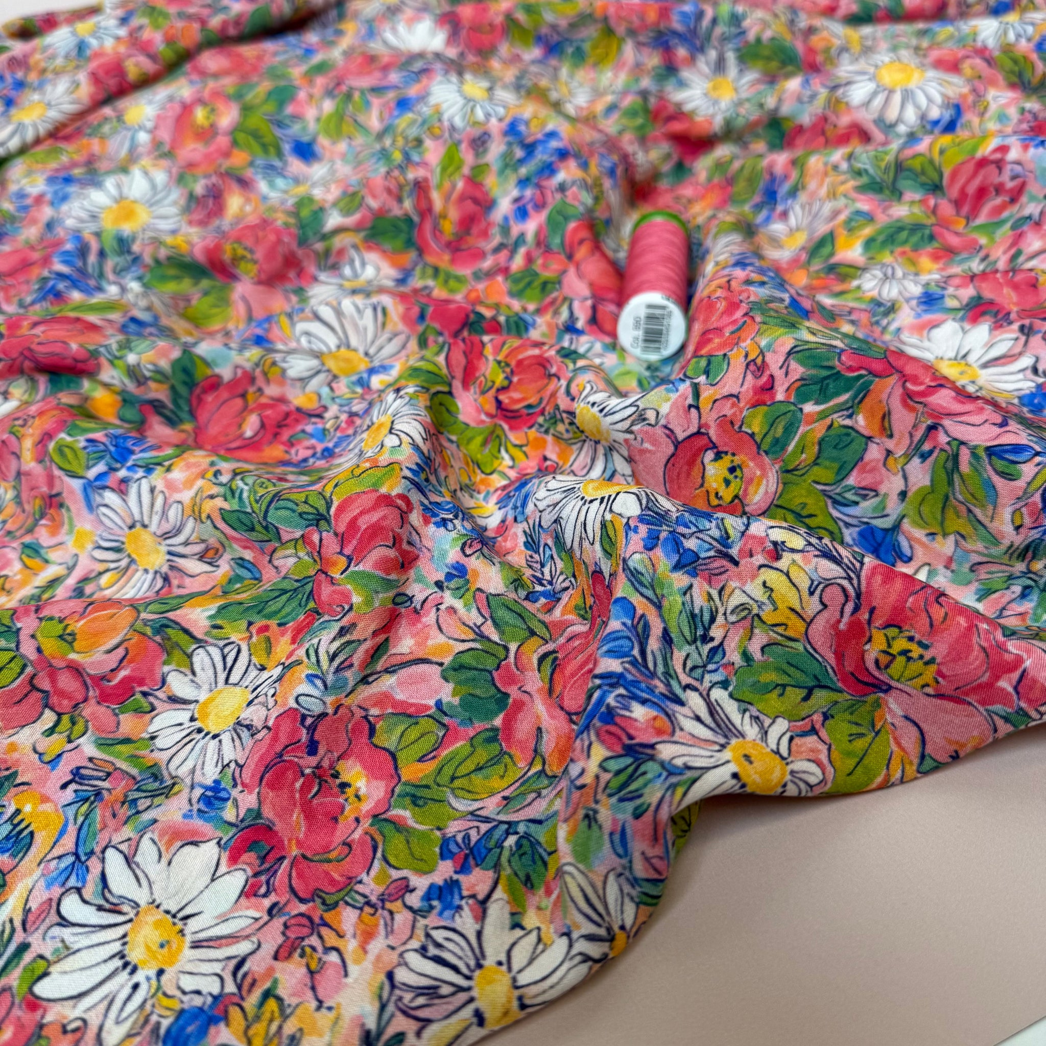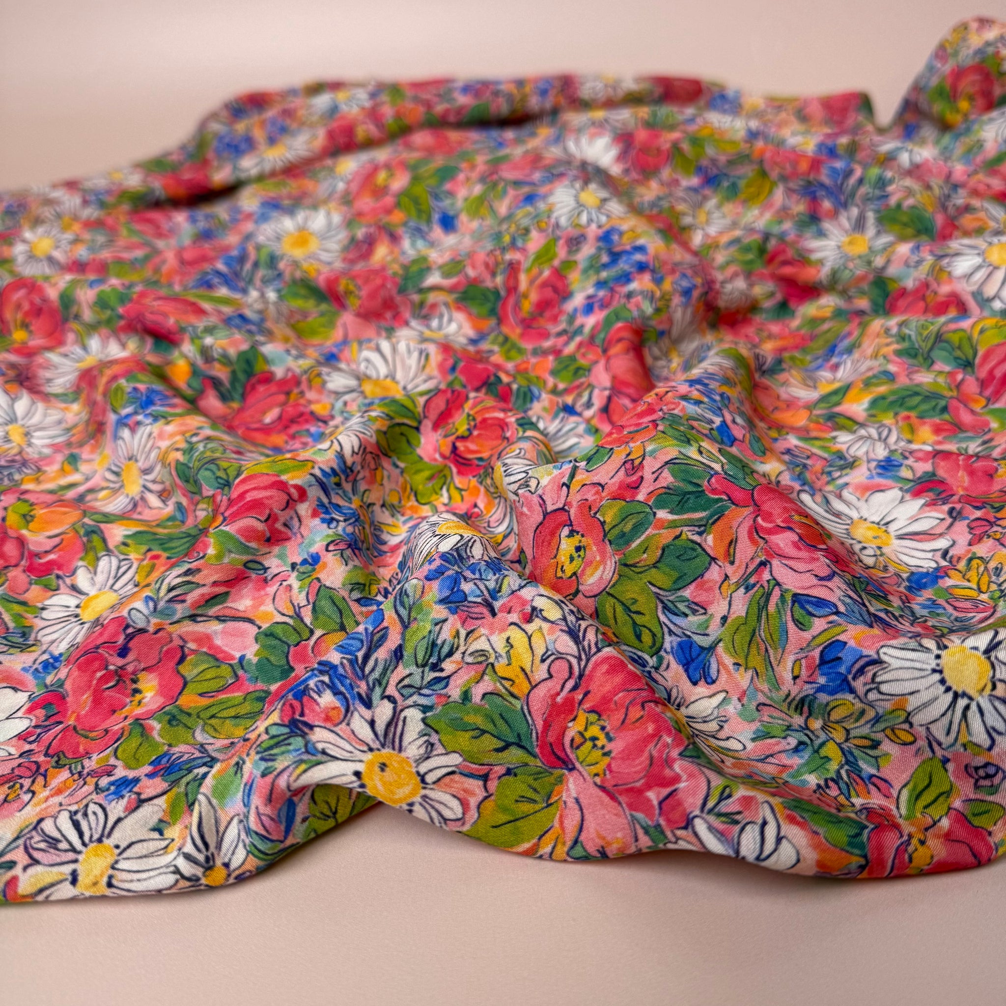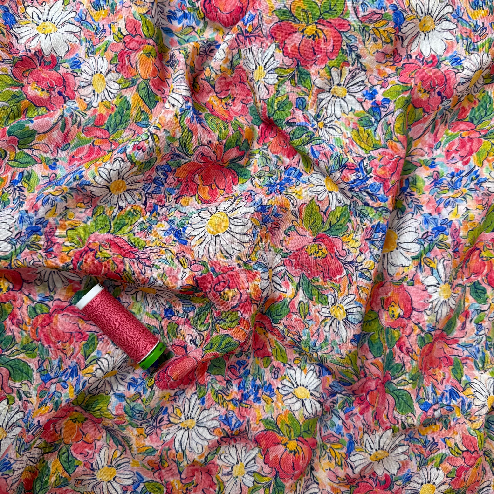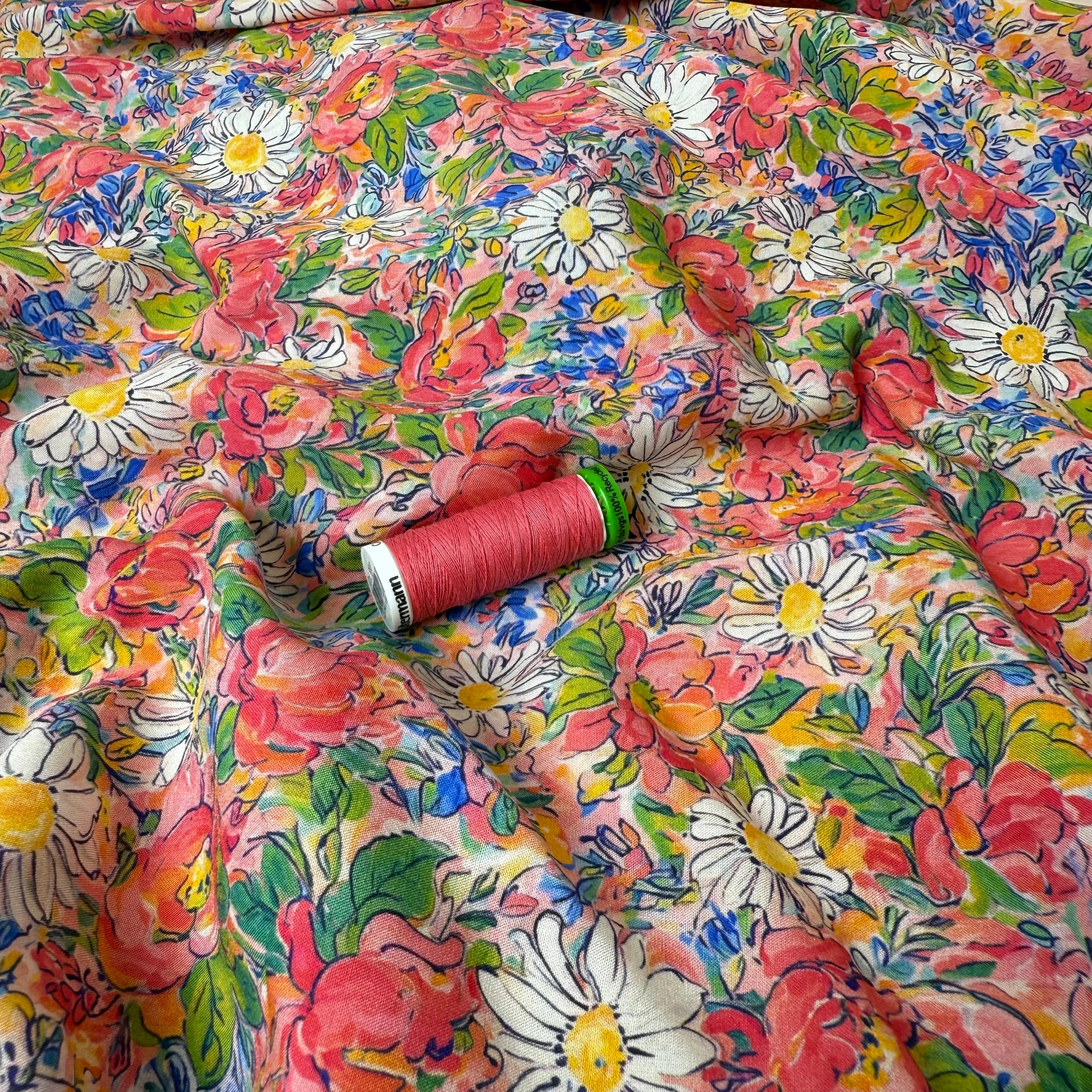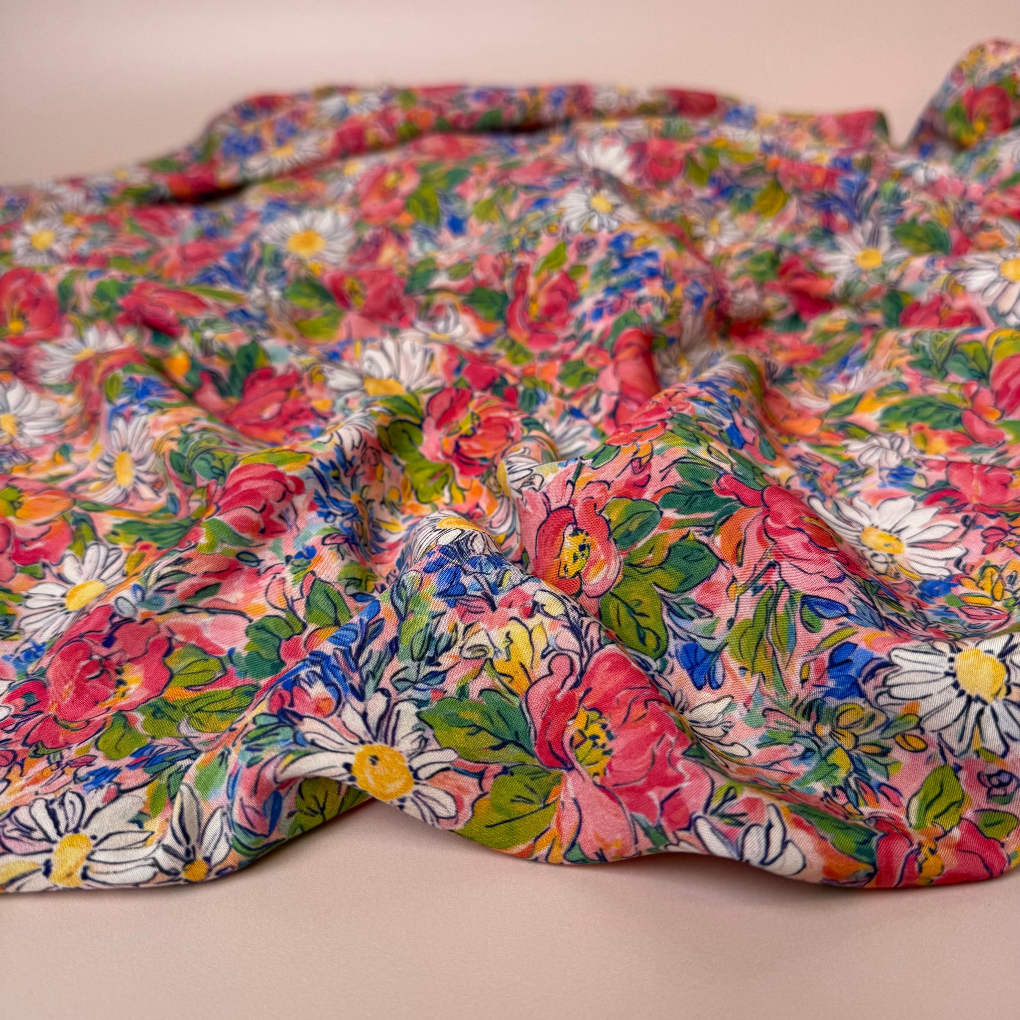 This elegant and beautiful, suitably manufactured high quality viscose fabric features the most beautiful meadow floral design in pink, coral, cobalt blue and green accentuated with the white daisies throughout. It is lightweight and soft to touch with beautiful drape, perfect for summer dresses, blouses and skirts.