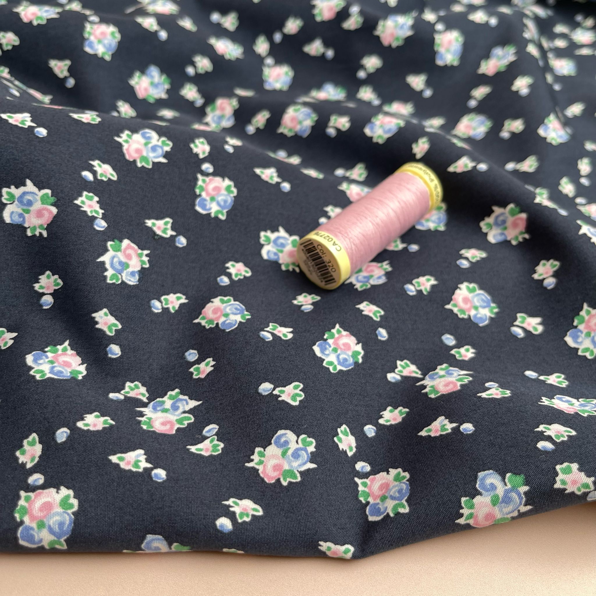 A beautiful and high quality, ex-designer lightweight cotton fabric featuring a sweet posey design in pale blue and pink on a black background. This fabric is ideal for dressmaking as it offers the great qualities of breath-ability of cotton, is a dream to sew with and to wear.
