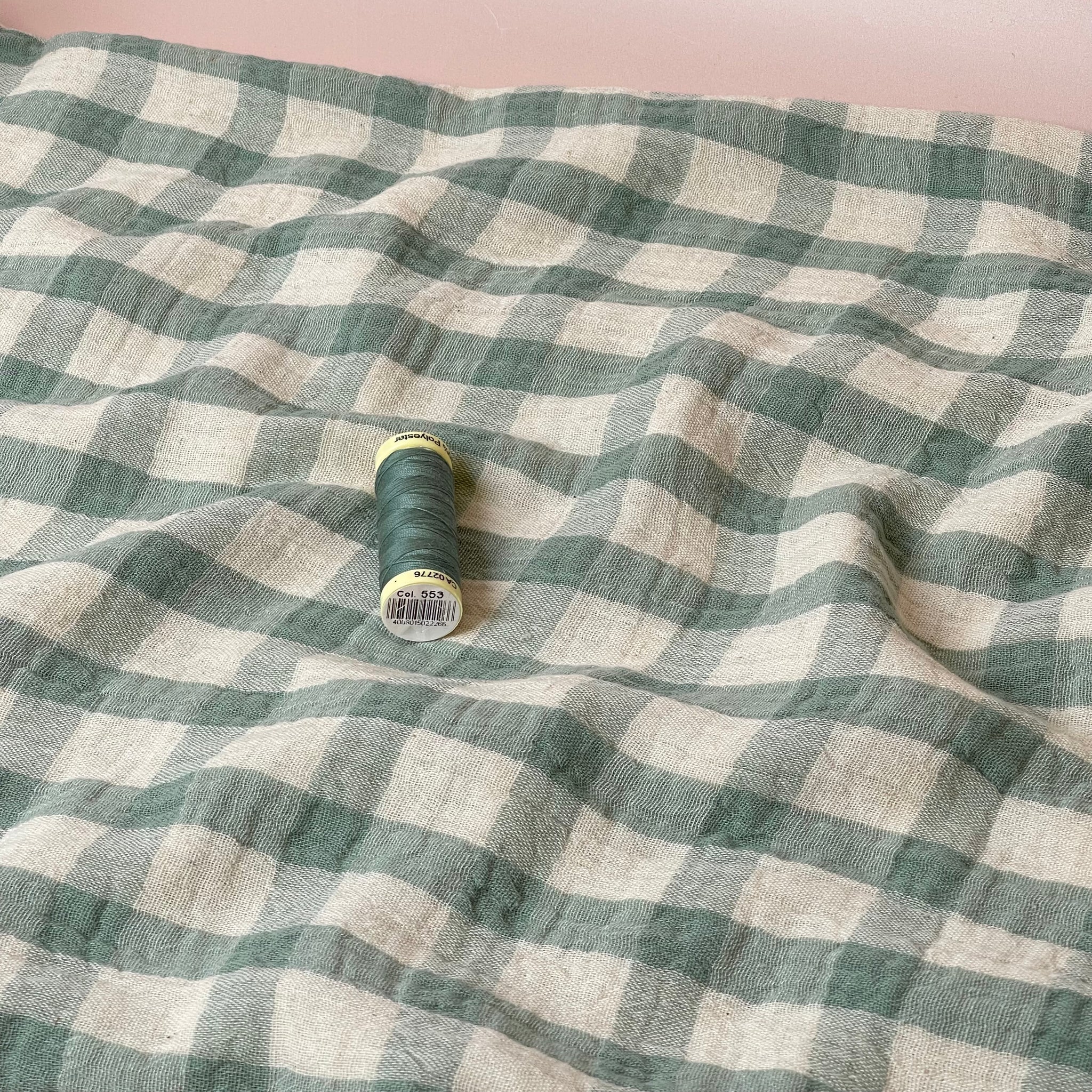 This beautiful yarn dyed cotton linen mix double gauze is very soft and features a check pattern in shades of sage, on an off-white background. This fabric is perfect for spring and summer sewing.