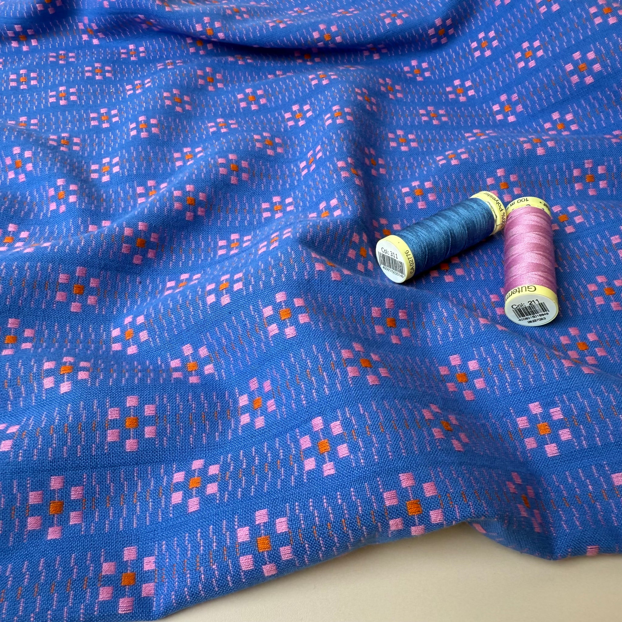 Cobalt Daisy is a yarn dyed cotton fabric featuring pink coloured yarns woven into a daisy floral stripe design on a cobalt blue background. The fabric is soft and lightweight, ideal for making dresses, blouses, accessories and children’s clothes.