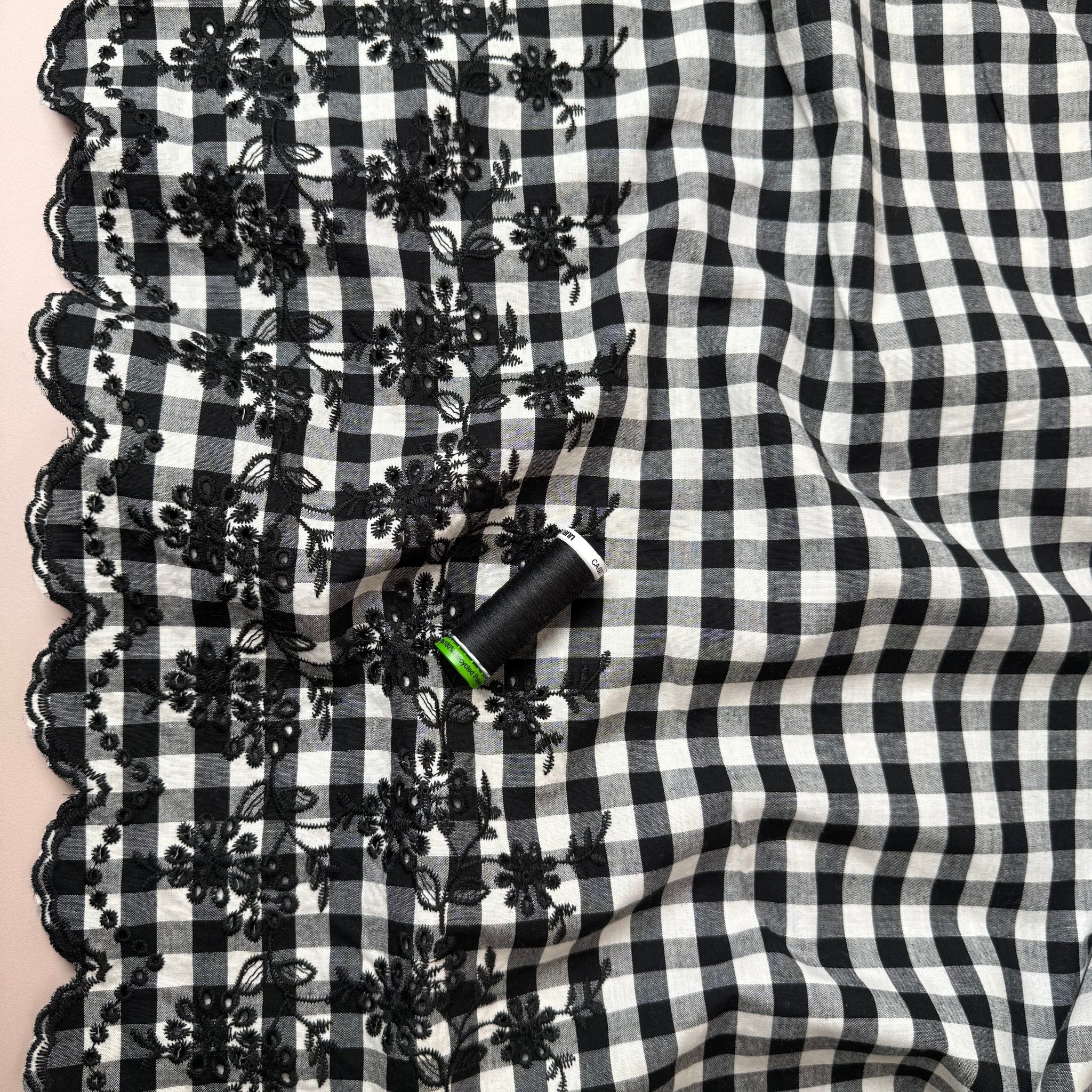 We are so pleased to be stocking this stunning, high quality embroidered cotton fabric. It features a beautiful gingham design in classic, chic black and white. The edges of this fabric are scalloped on both sides, with delicate floral embroidery in black thread.