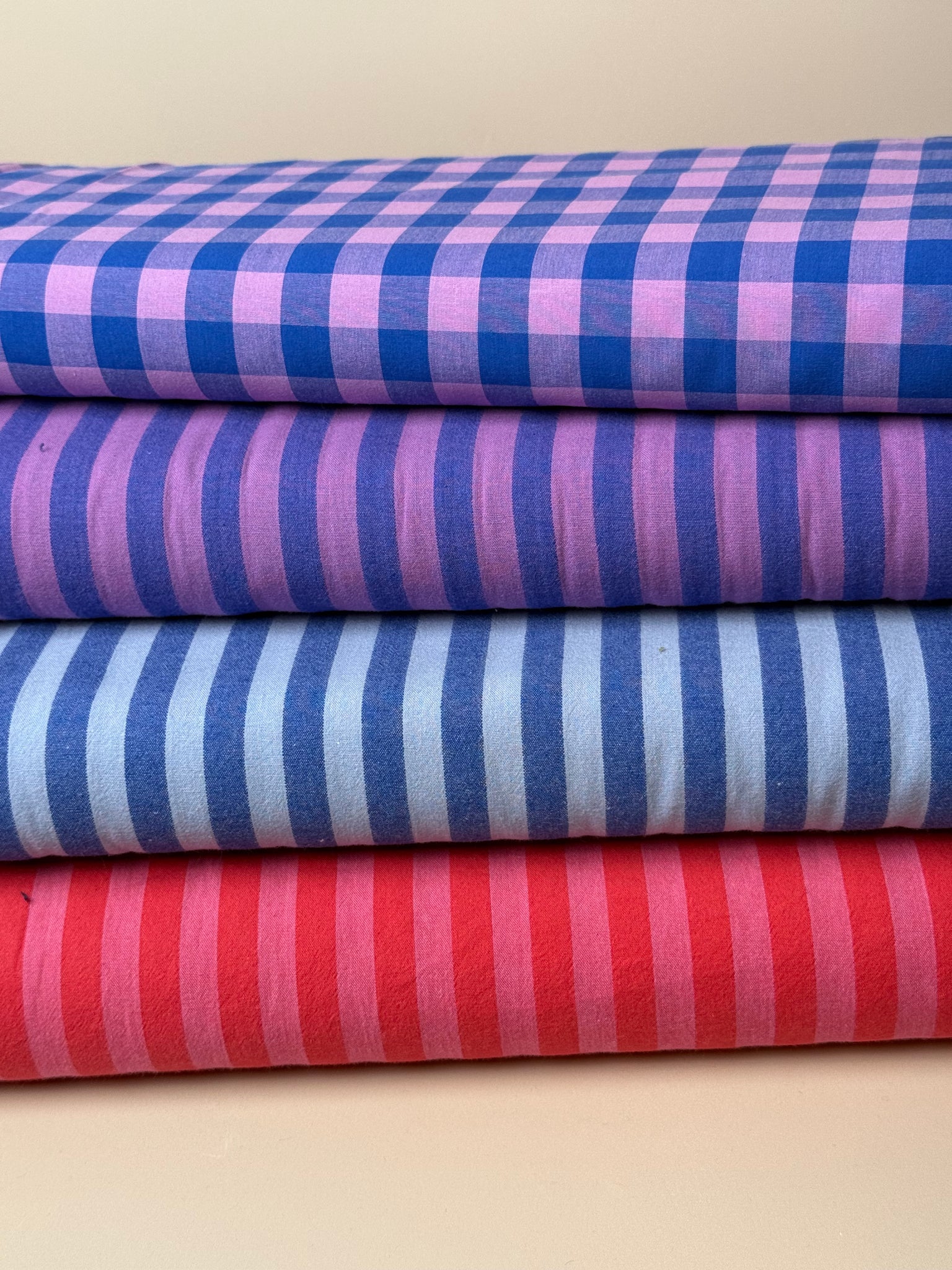 We are so pleased to be stocking this stunning, high quality, yarn dyed cotton fabric. It features a stunning gingham design in French mauve and dusky blue.