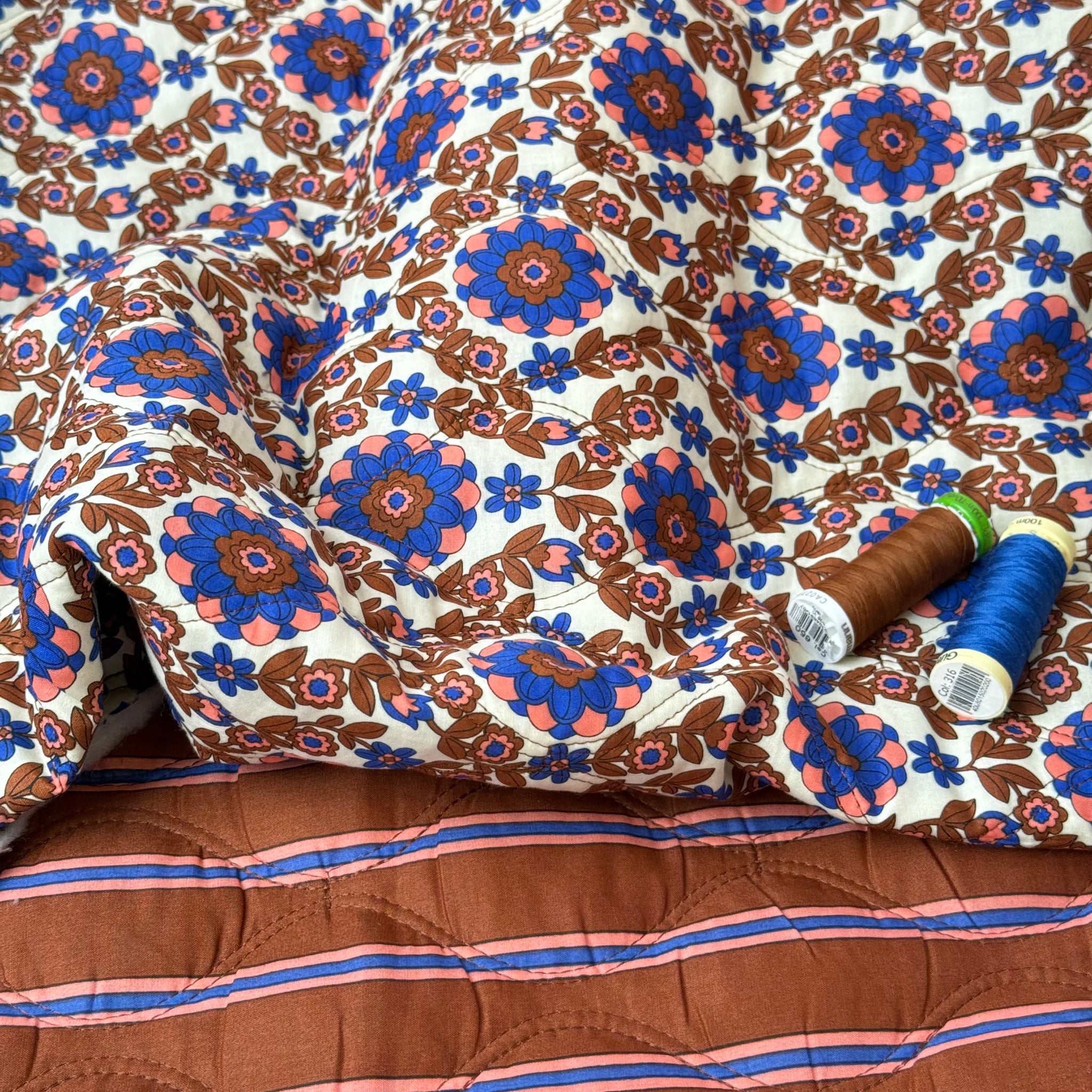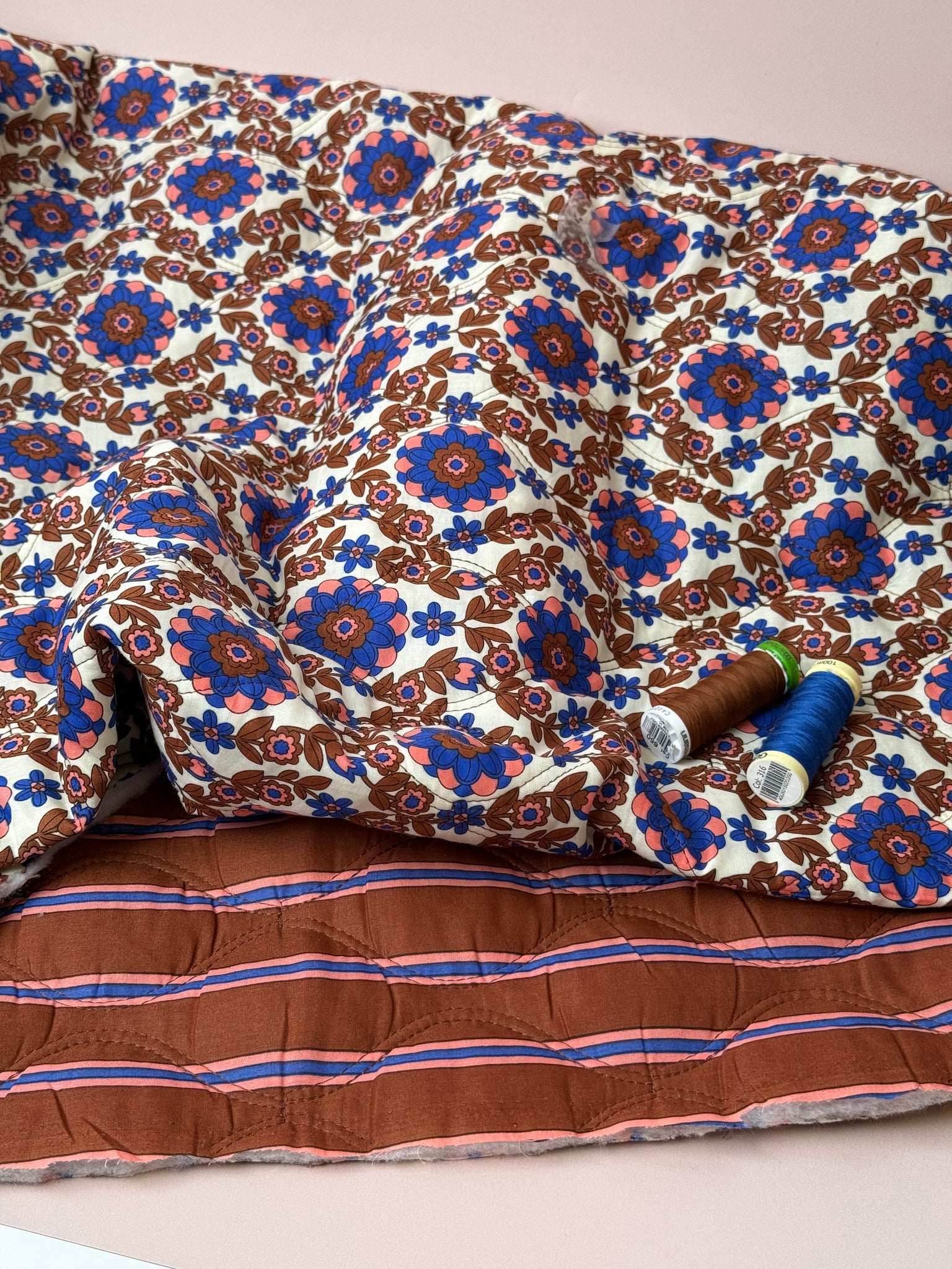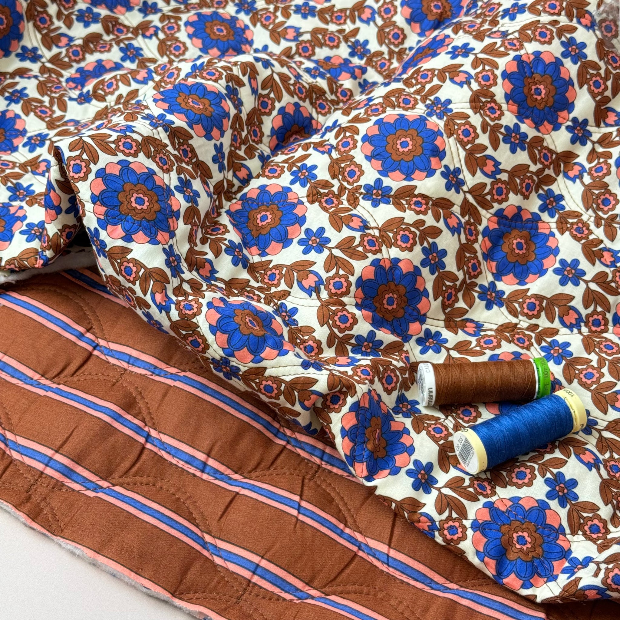 This wadded, pre-quilted fabric is perfect for making lightweight and very cosy jackets or vests for all year round. The fabric features kaleidoscope floral design in shades of blue and brown on one side and stripes in pink and blue on a toffee brown background on the reverse with padding sewn between the two layers.