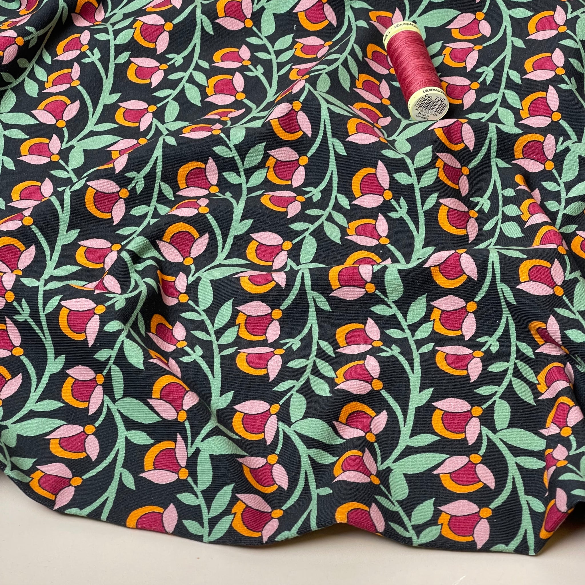 High quality cotton french terry fabric with looped back. It features graphic floral design in pink orange and green on black background.