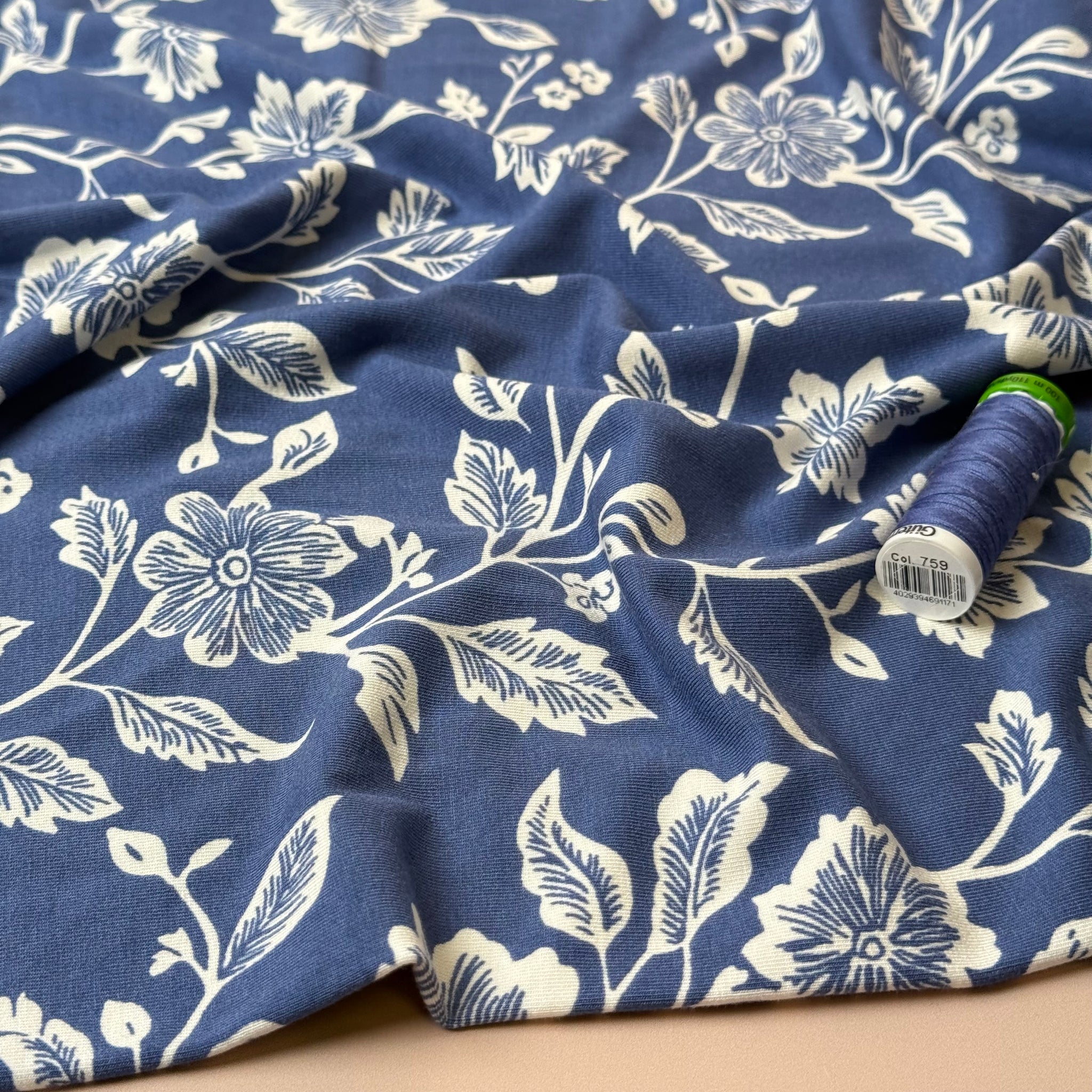 A wonderfully soft and beautiful viscose jersey fabric with ample drape, and an elegant ecru floral design over a cornflower blue background. This knitted fabric has generous stretch and good recovery, offering beautiful drape and bounce.