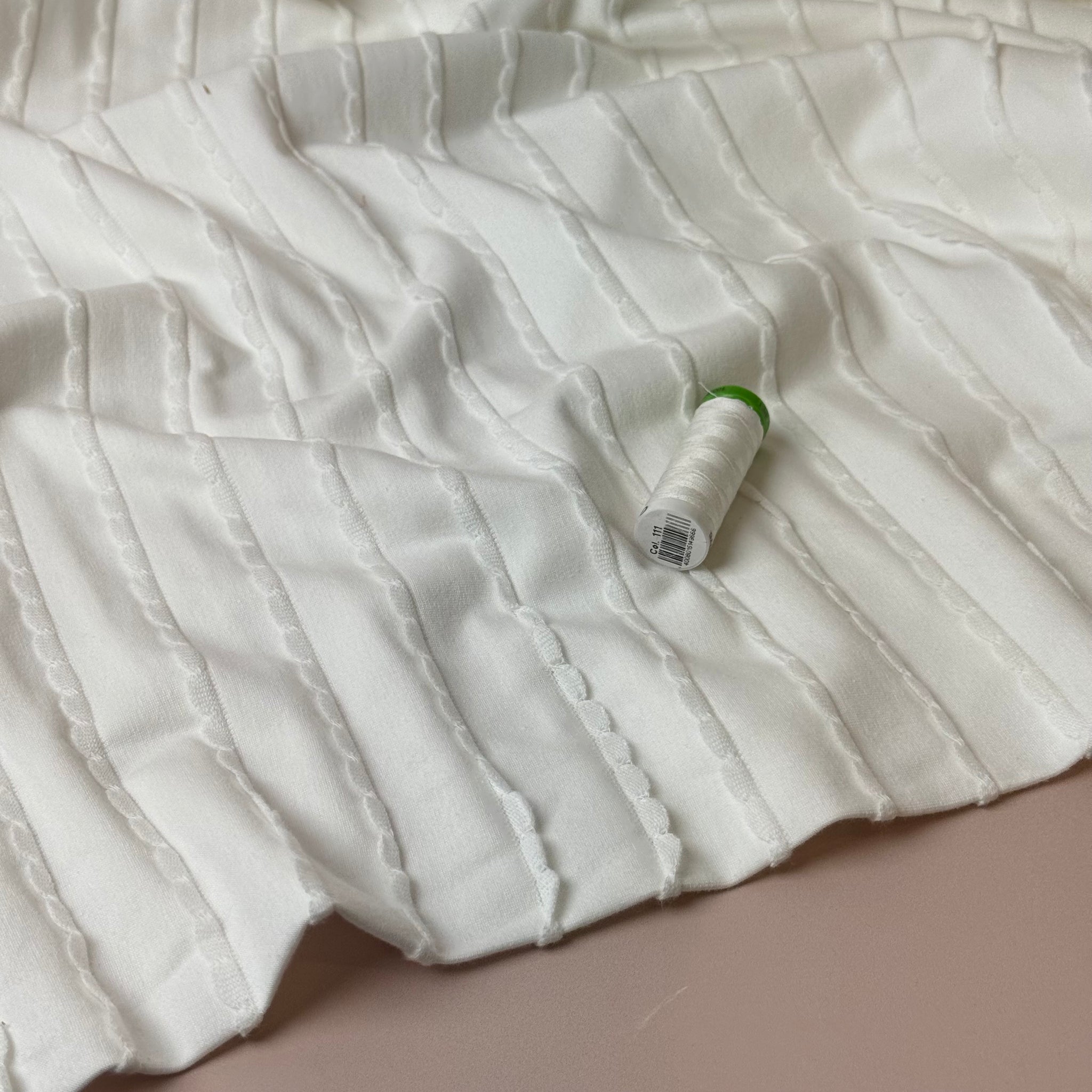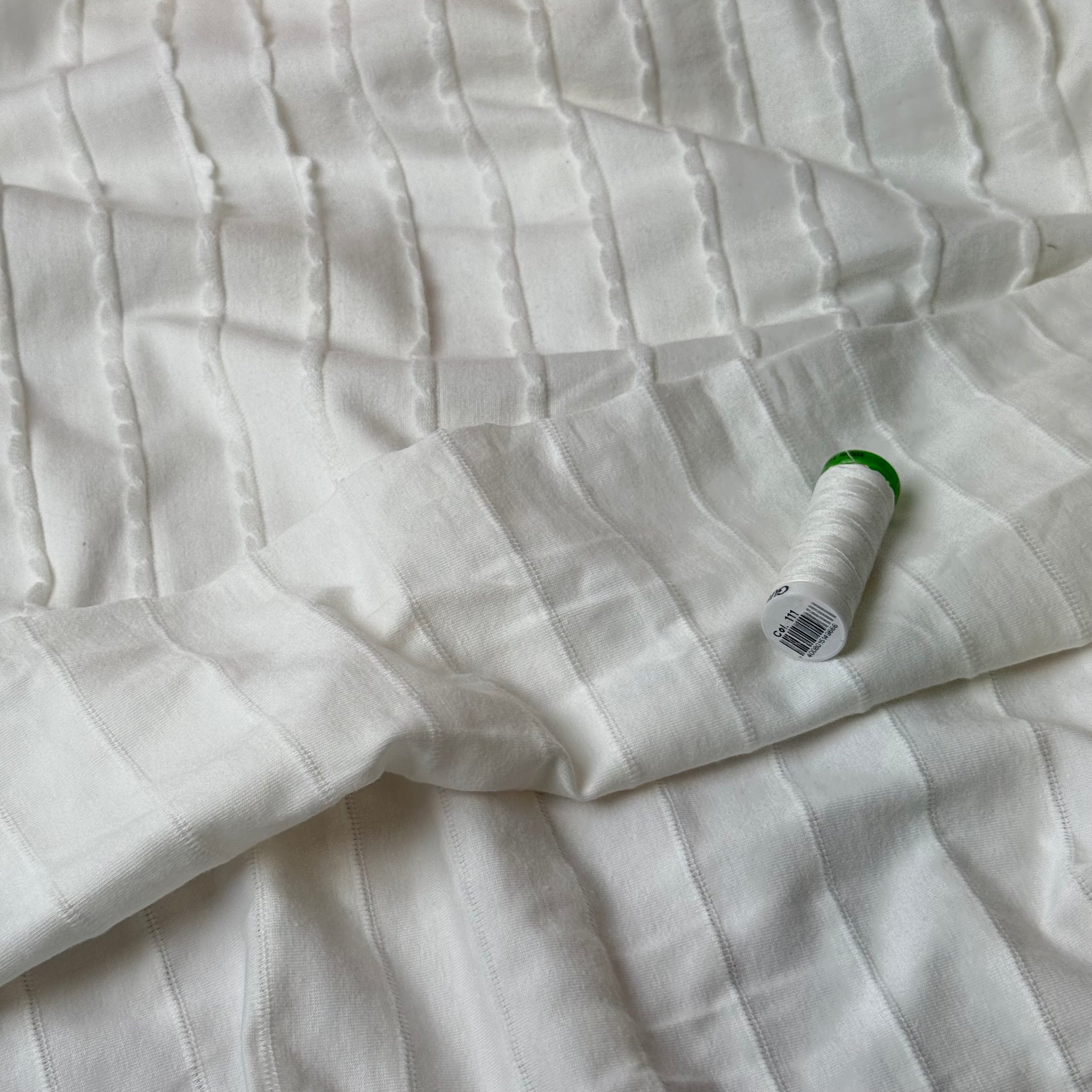 An elegant and soft, high quality cotton single knit jersey fabric with knitted frills added in horizontal lines which will add a beautiful feature to your T-shirts and dresses made from it. It is cosy and comfortable and feels a little weightier due to this added feature.