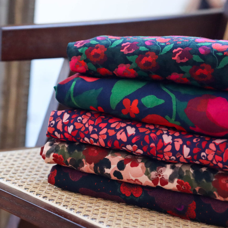 Part of the No Rain No Flowers collection, the Flower Drips viscose twill features dusty pink and burgundy flowers seem to melt into a haze of black and khaki.