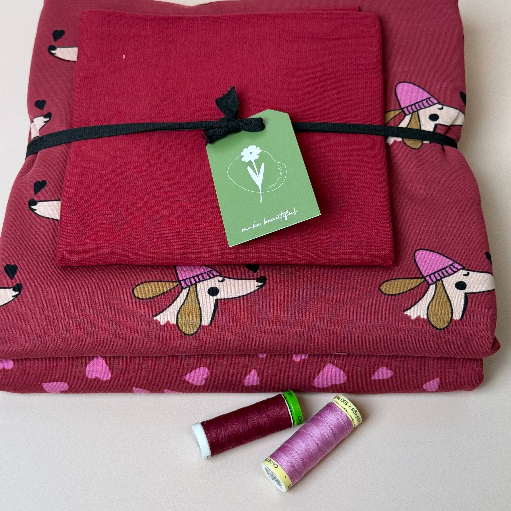 Make an Outfit Colour Bundle - Dogs and Heart Berry Cotton Sweat-shirting with Ribbing