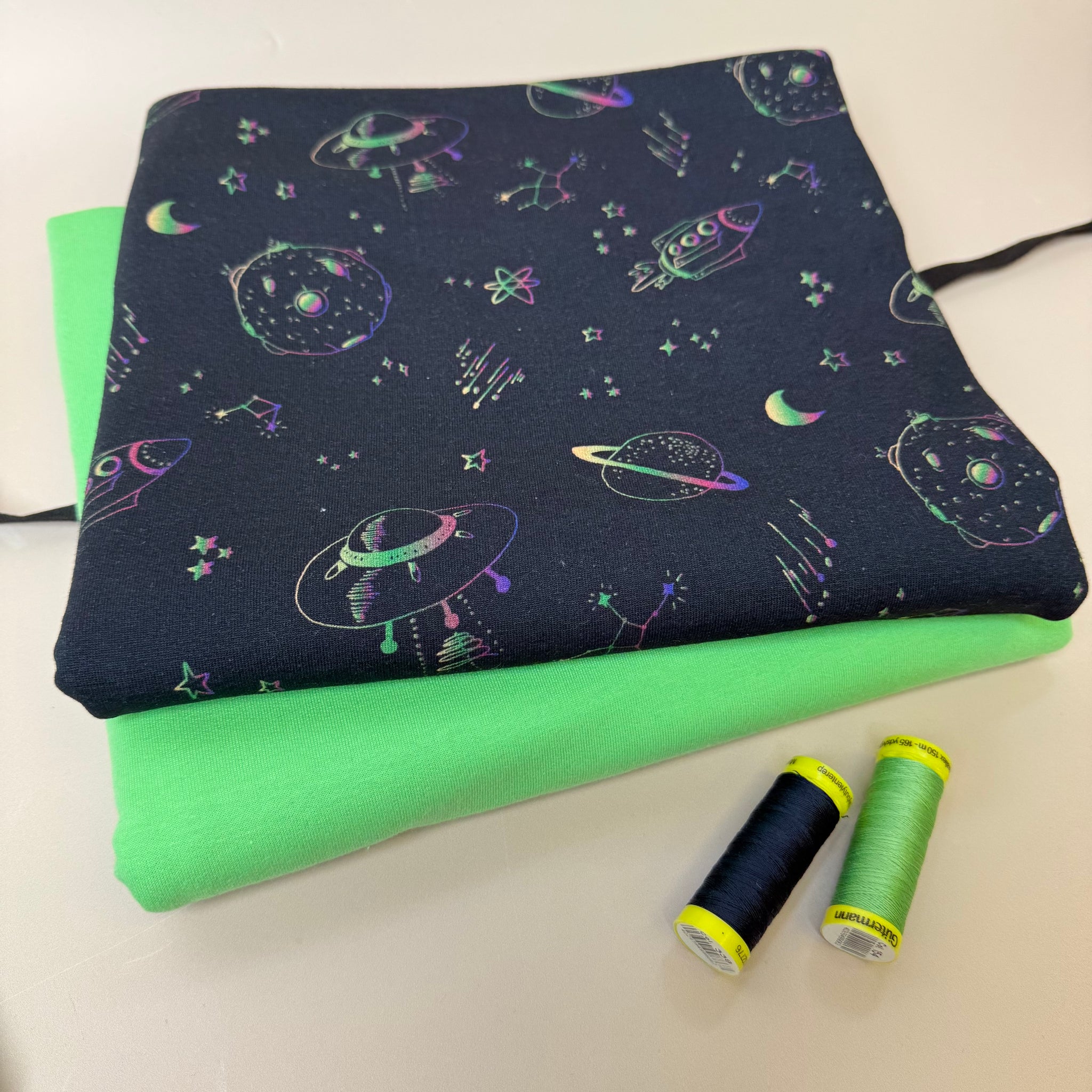 In this bundle we paired a galaxy print cotton french terry with our popular Peach Soft GOTS Organic sweatshirting in lime shade and cuff ribbing in the same shade. They are ideal for sewing a cosy and comfortable matching joggers and a sweater or any other cosy complementary outfit.
