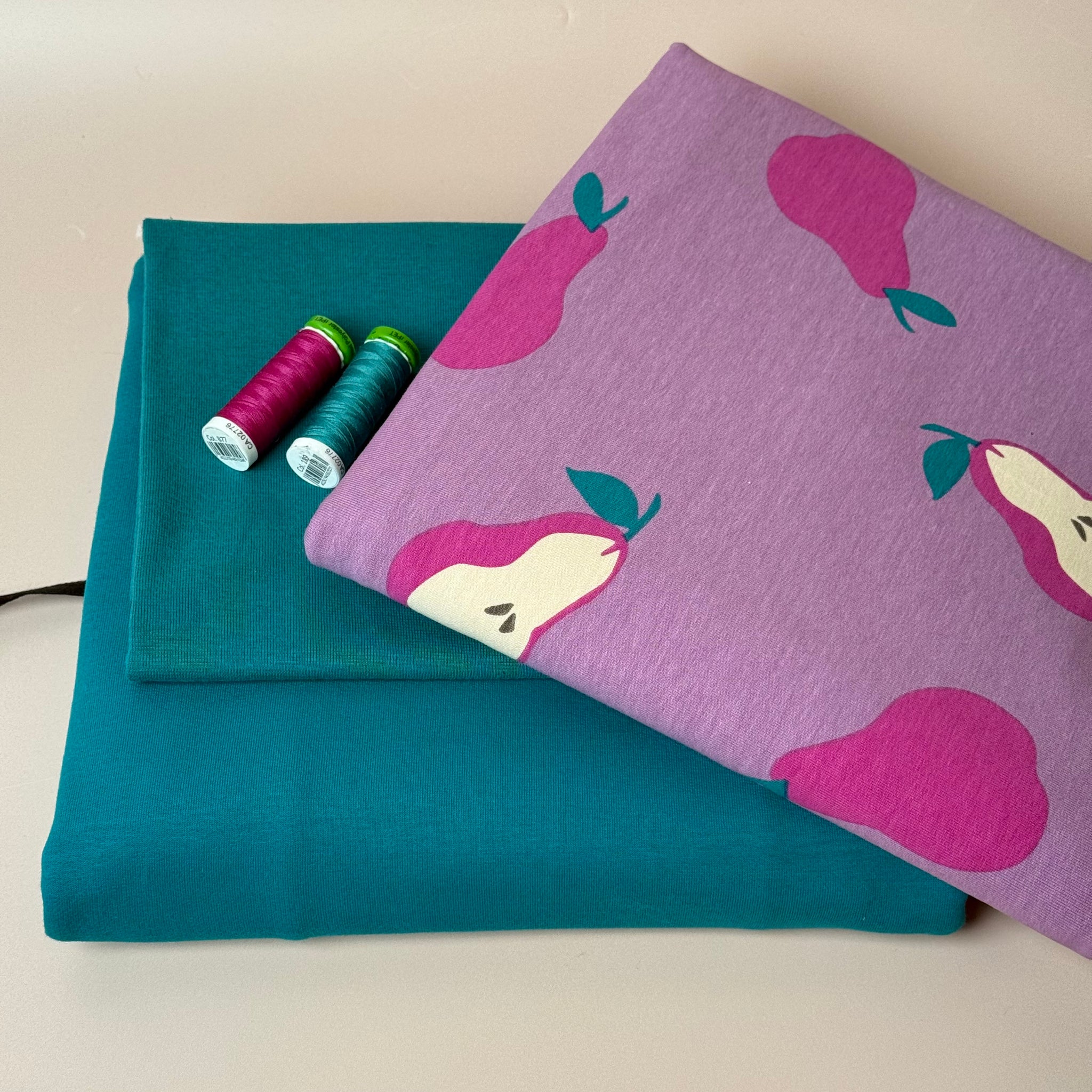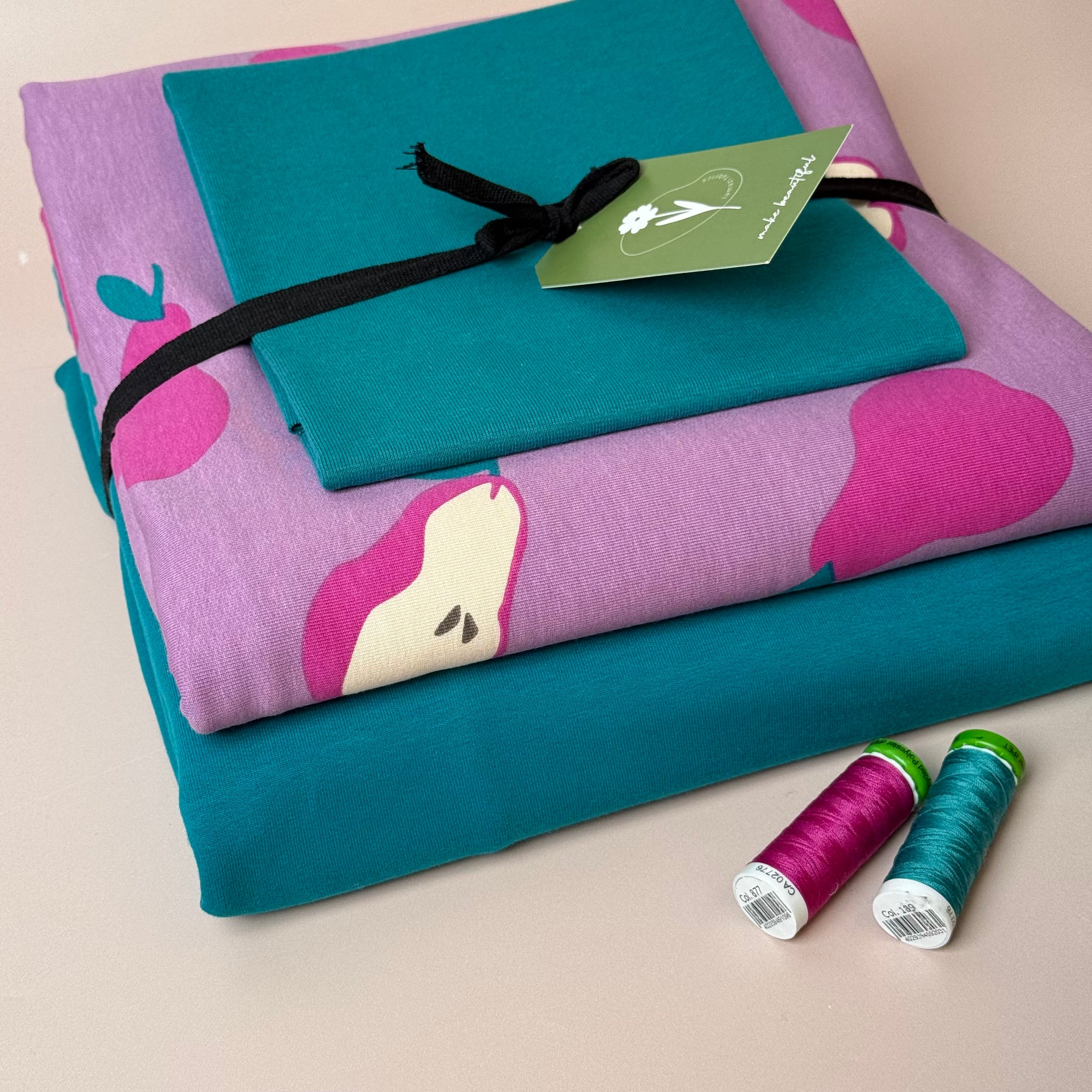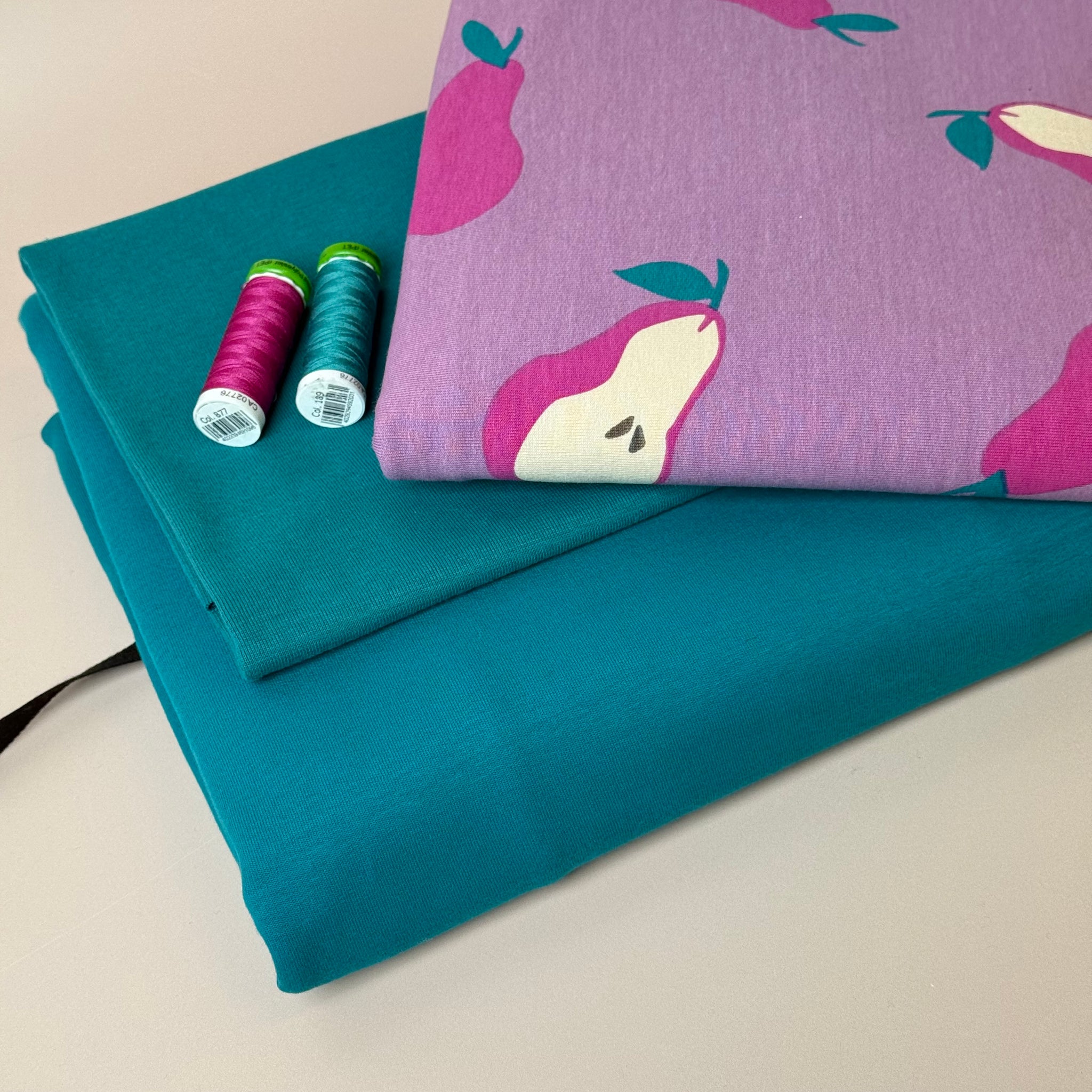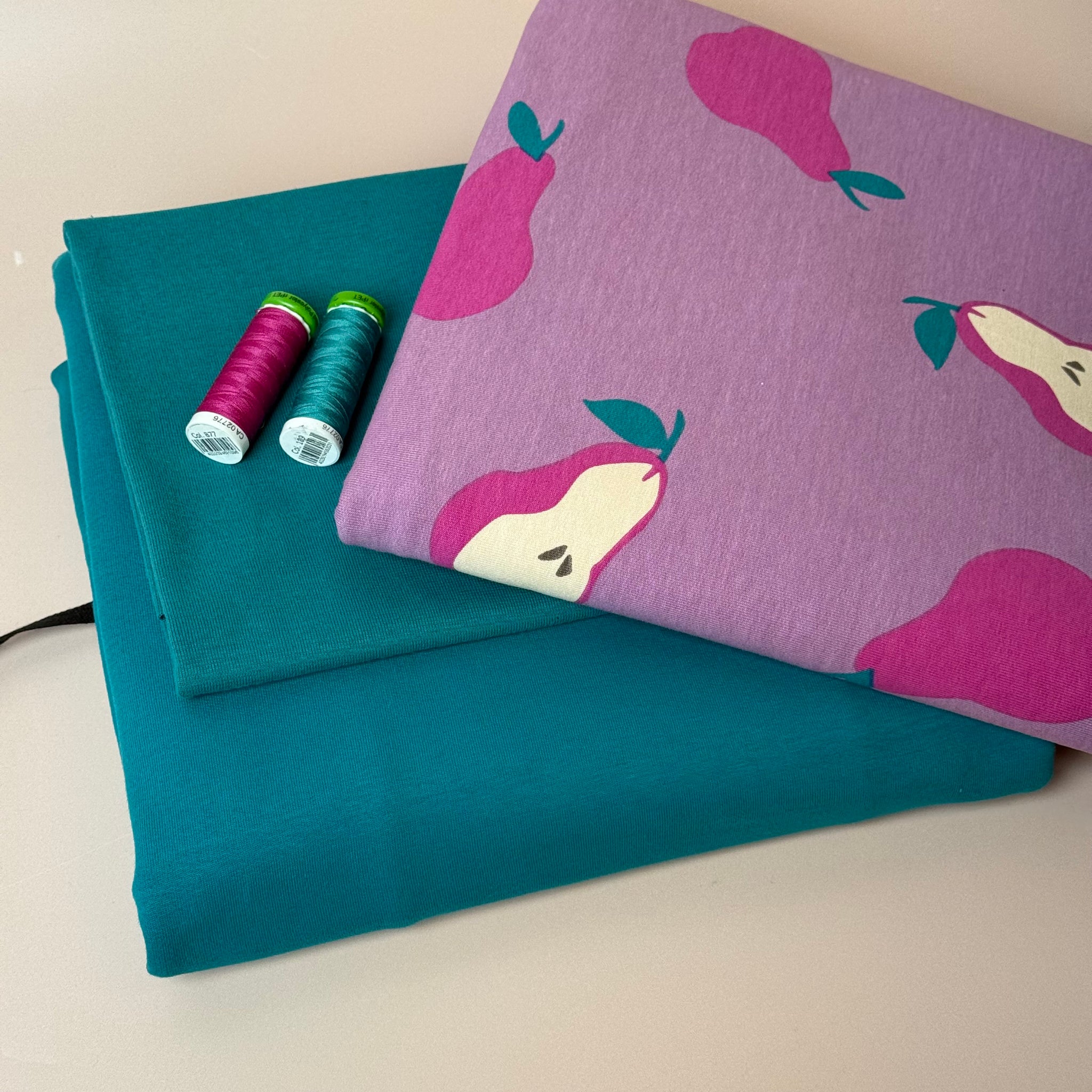 In this bundle we paired this fun and playful cotton french terry featuring pears with our popular Peach Soft GOTS Organic sweatshirting in Teal shade and cuff ribbing in the same shade. They are ideal for sewing a cosy and comfortable matching joggers and a sweater or any other cosy complementary outfit.