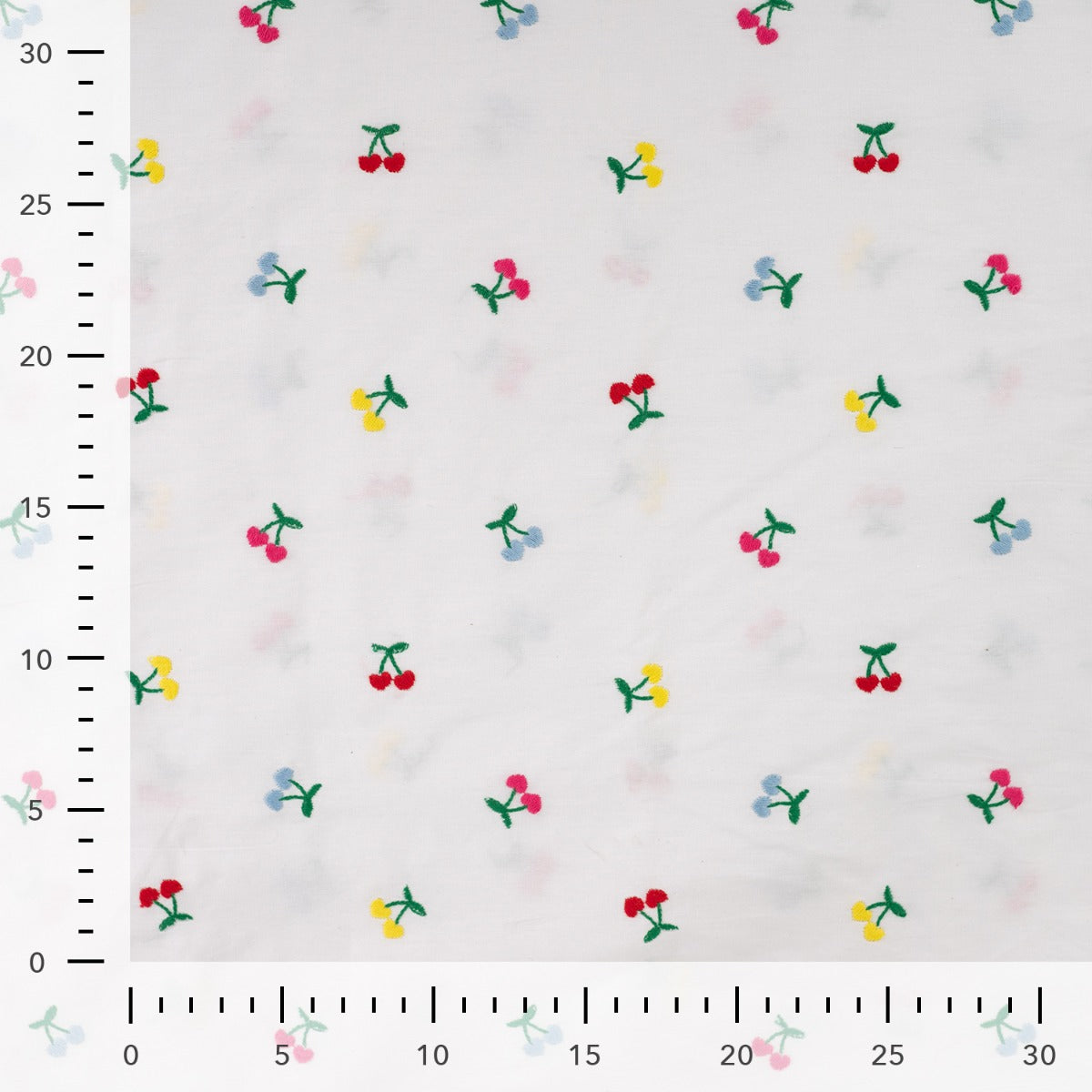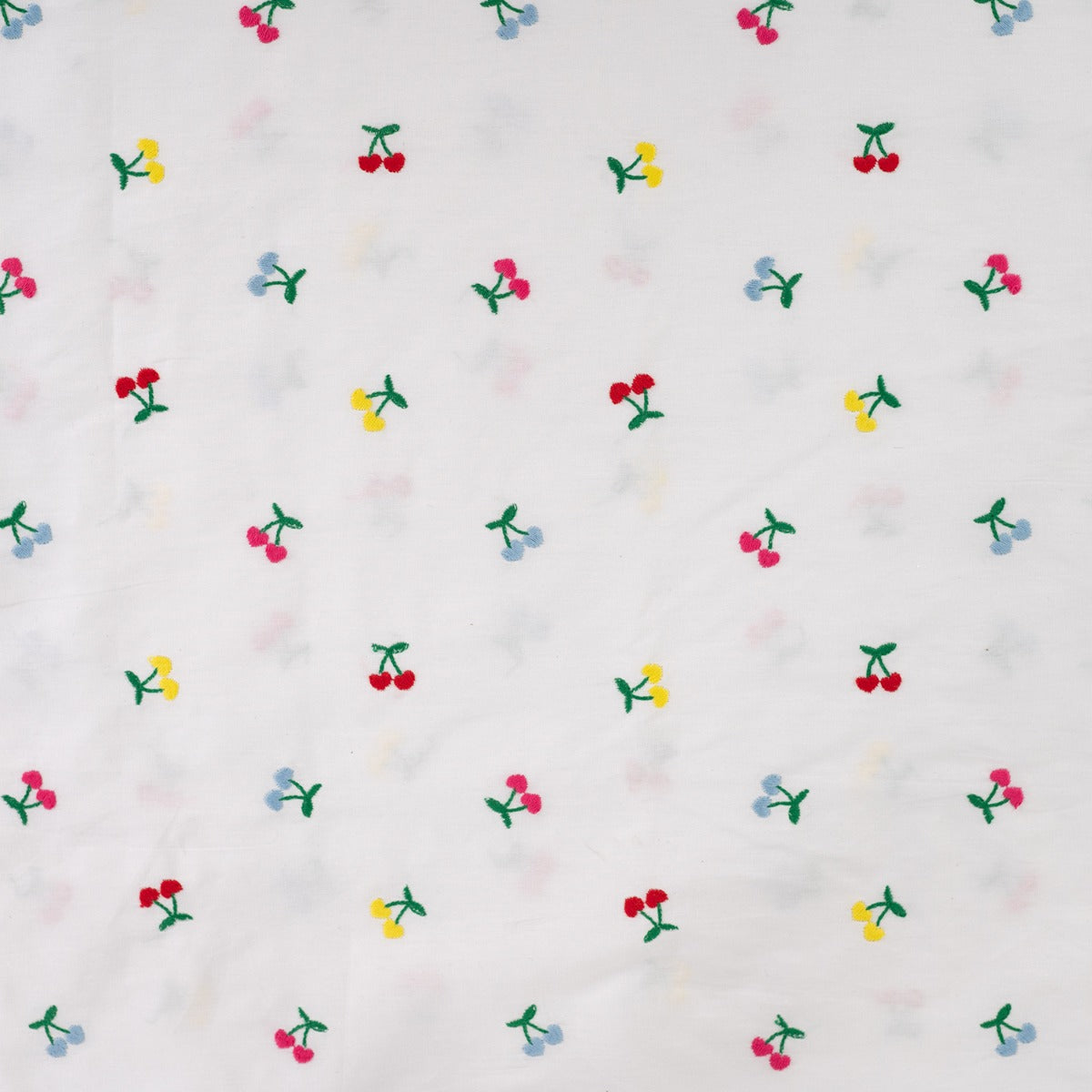Stunning white cotton poplin with multicoloured embroidered cherries in the shape of hearts.  It is a lightweight and slightly structured embroidered cotton fabric, very easy to sew with and ideal for summer wardrobe. It will keep you cool in the summer and it is great for sewing shirt dresses, blouses, dresses, skirts, tunics or accessories