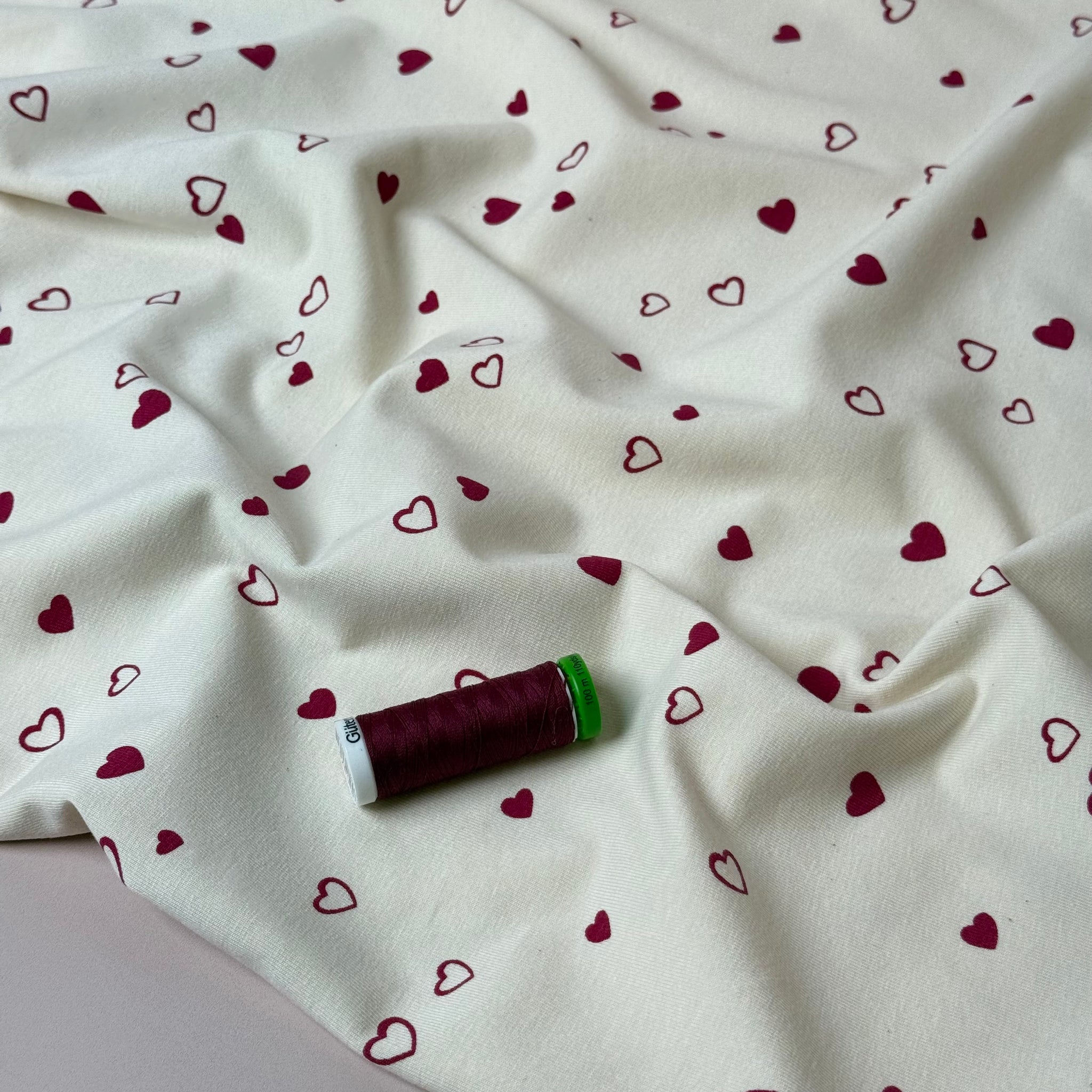 This softest cosy Organic Cotton Jersey features cute hearts in berry on a natural off-white background. This fabric is cosy and comfortable and will bring you a lot of joy when sewing and wearing.