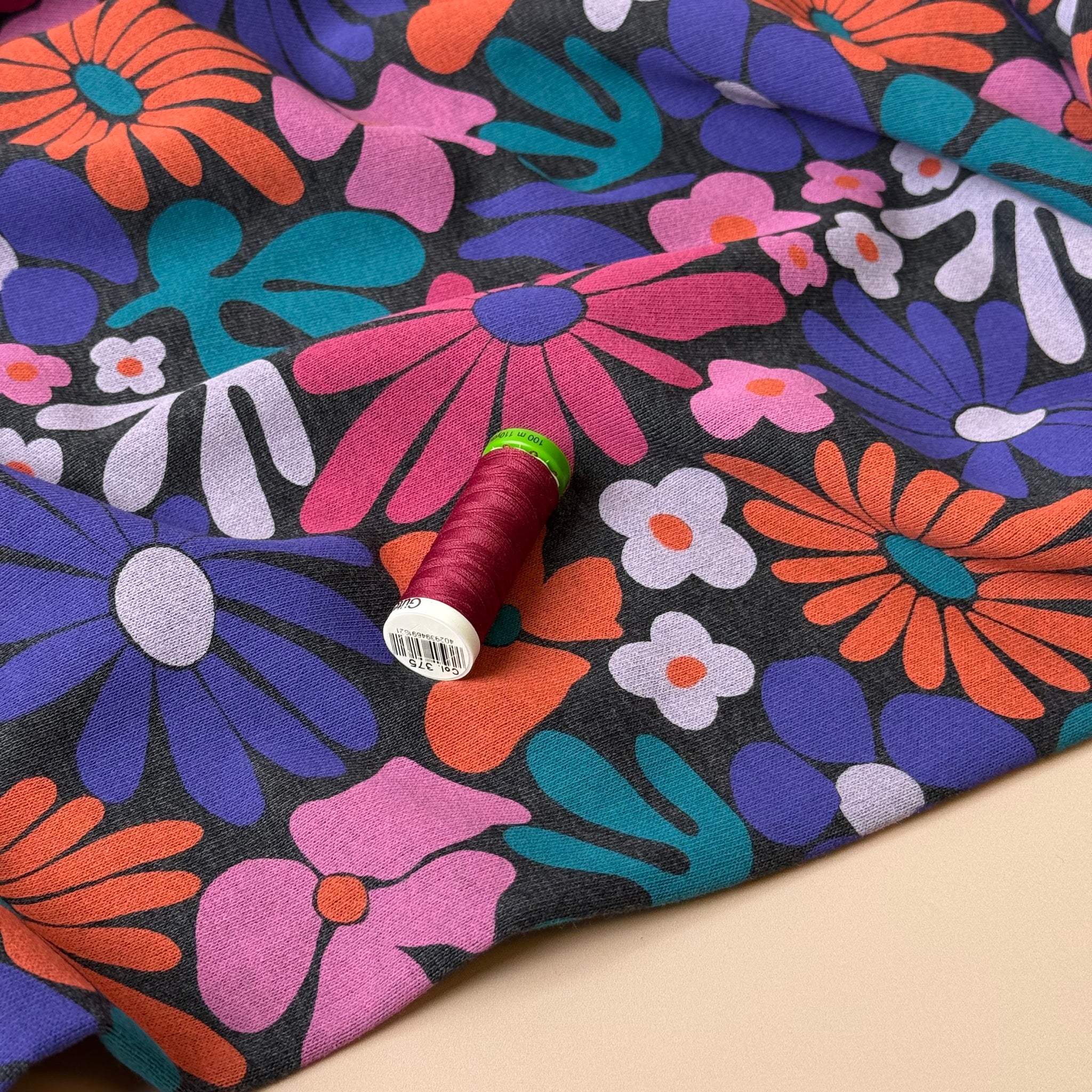This soft, brushed sweat-shirting fabric has fleecy back and matte touch. It features beautiful graphic floral design in burnt orange, purple and lilac grey on a neutral dark grey melange background. It is ideal for making cosy and comfortable sweaters, hoodies, sweater-dresses, joggers, cardigans and trousers. You will not want to take the garments off made from this fabric.