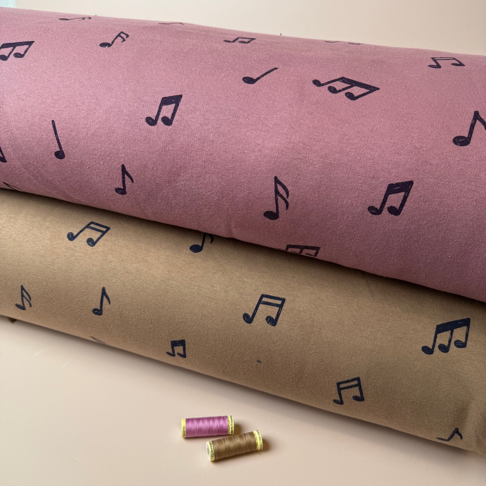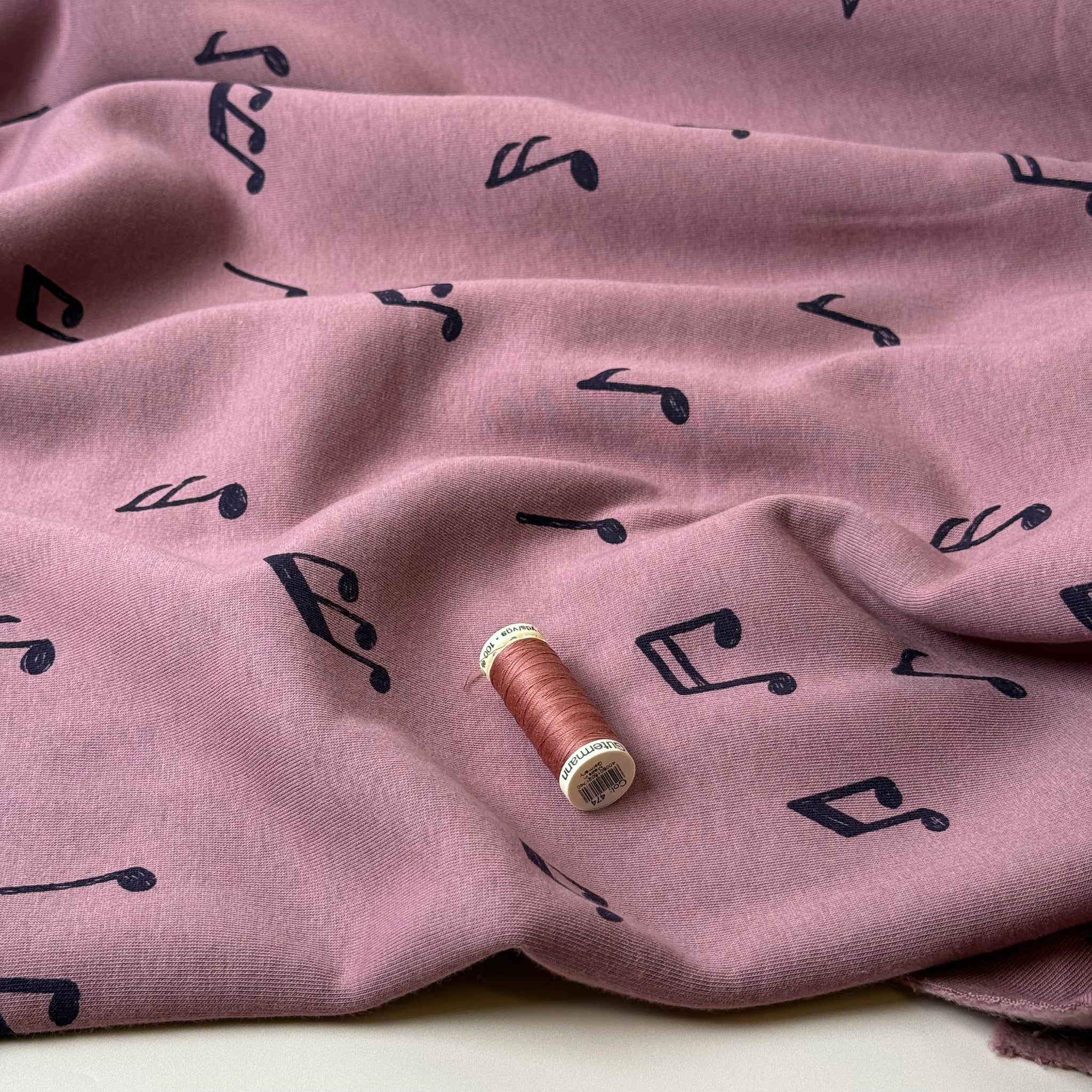 This is the softest, brushed sweat-shirting fabric in our range with fleecy back and matte touch. This fabric features music notes in black on a mauve background. It is ideal for making cosy and comfortable sweaters, hoodies, sweater-dresses, joggers, cardigans and trousers. You will not want to take the garments off made from this fabric.