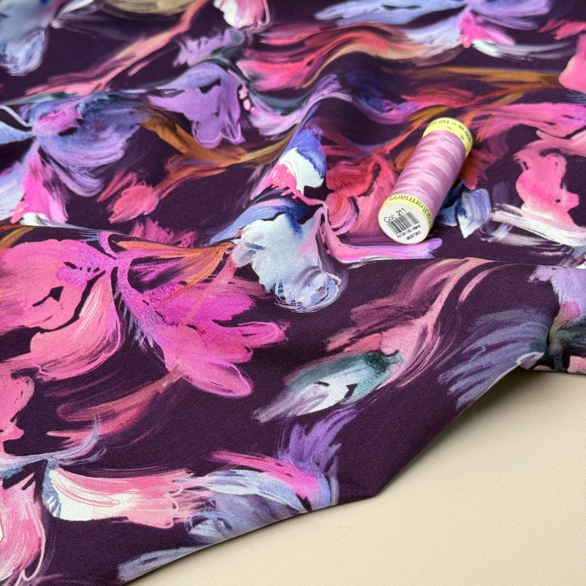 This high quality viscose fabric features stunning painterly iris flowers purple, pink and lilac on rich plum background. It is lightweight and has the most pleasant handle, with silky soft hand finish and beautiful drape.