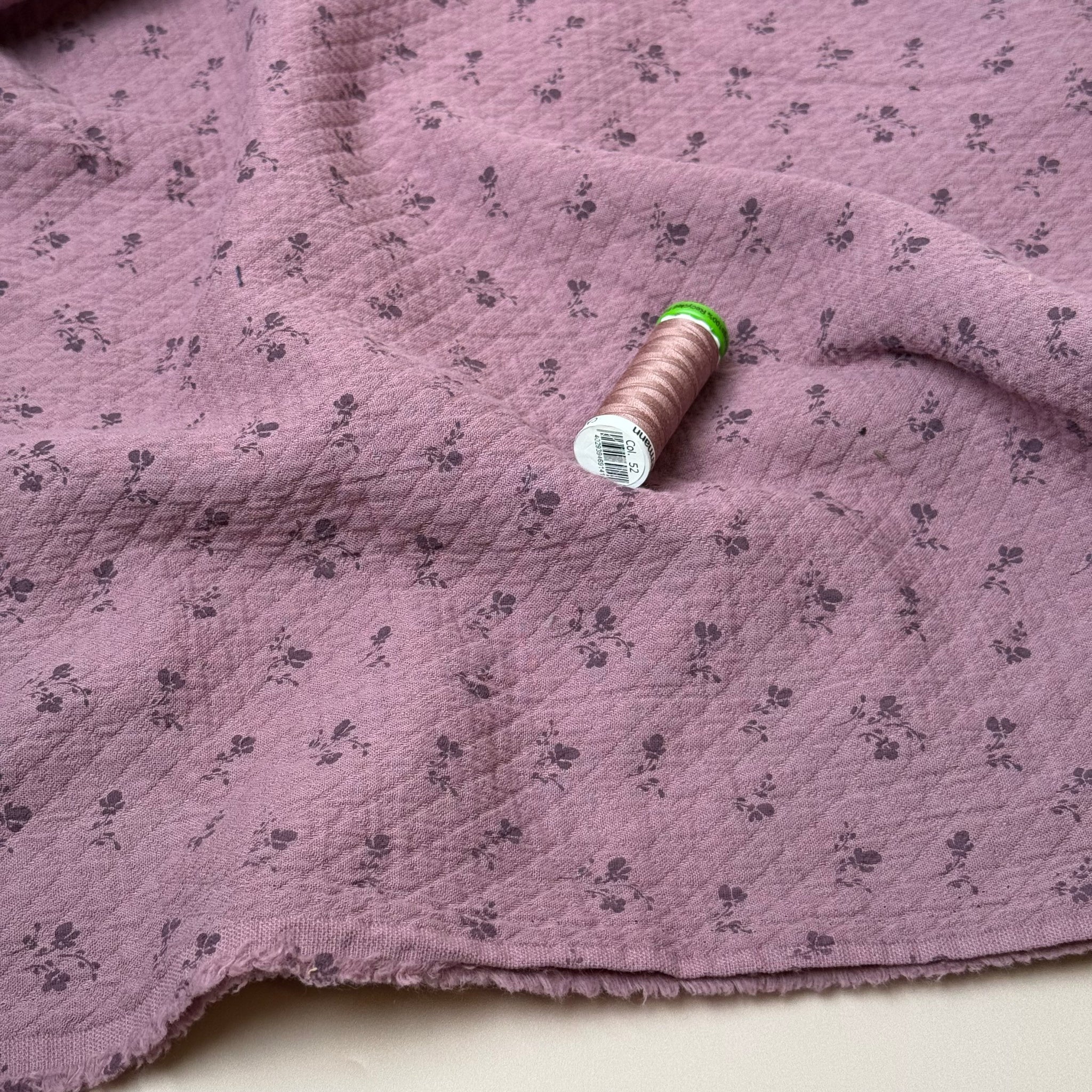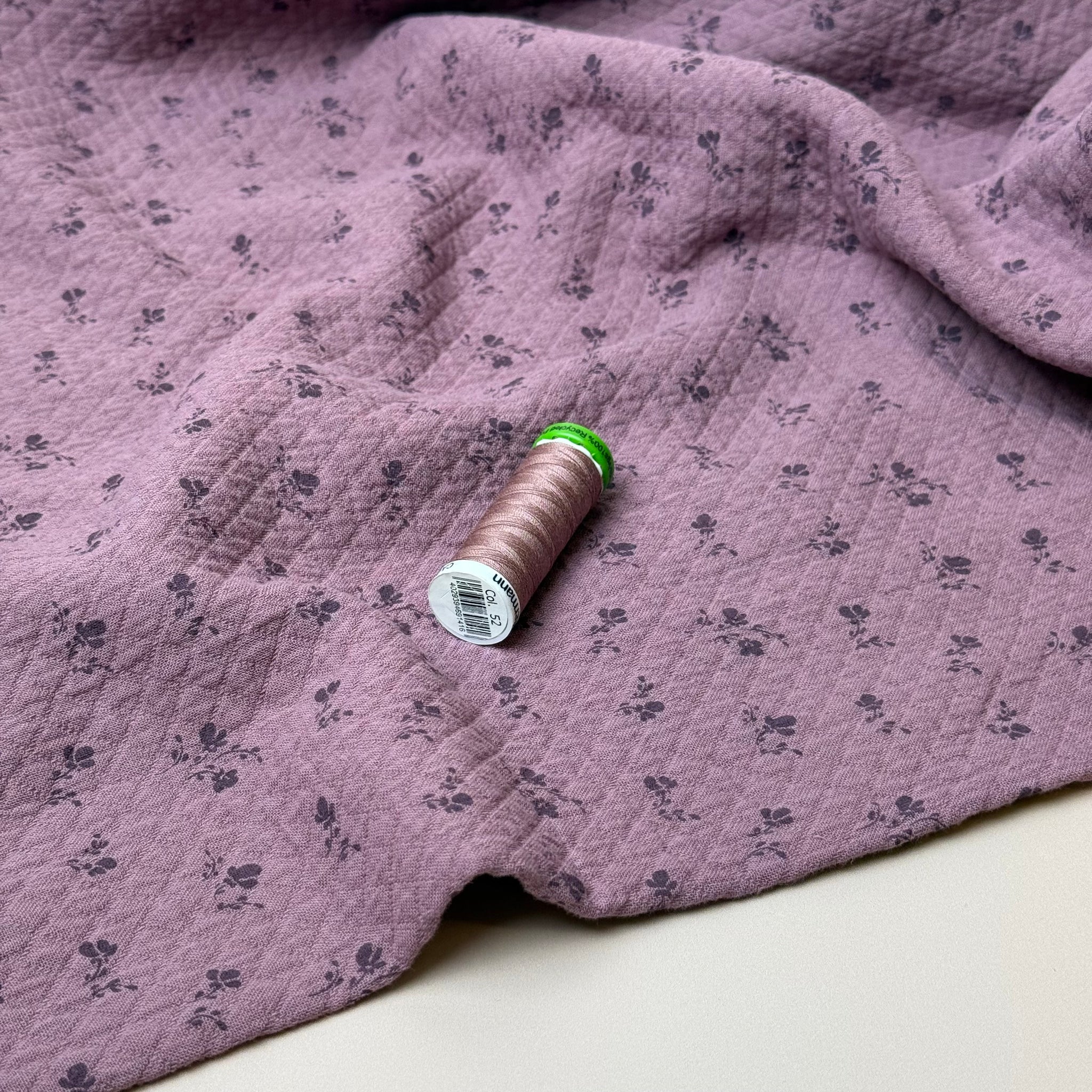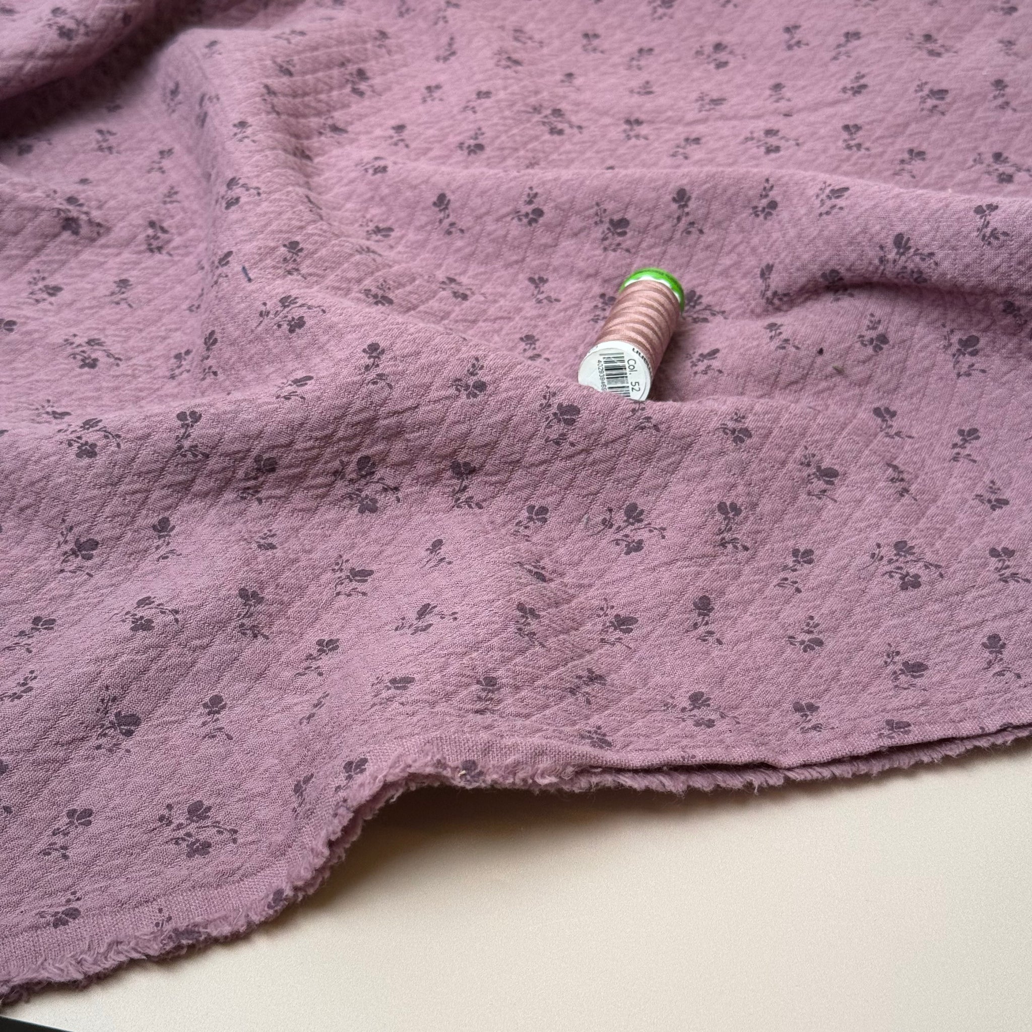 Unique and stunning pure cotton jacquard fabric with small diamond shapes woven into it. The special diamond jacquard weave gives this fabric a lovely structure, ideal for making summer jackets, tops, trousers, shorts and dresses. The fabric is yarn dyed in mauve colour and features ditsy flowers in darker mauve printed on it.