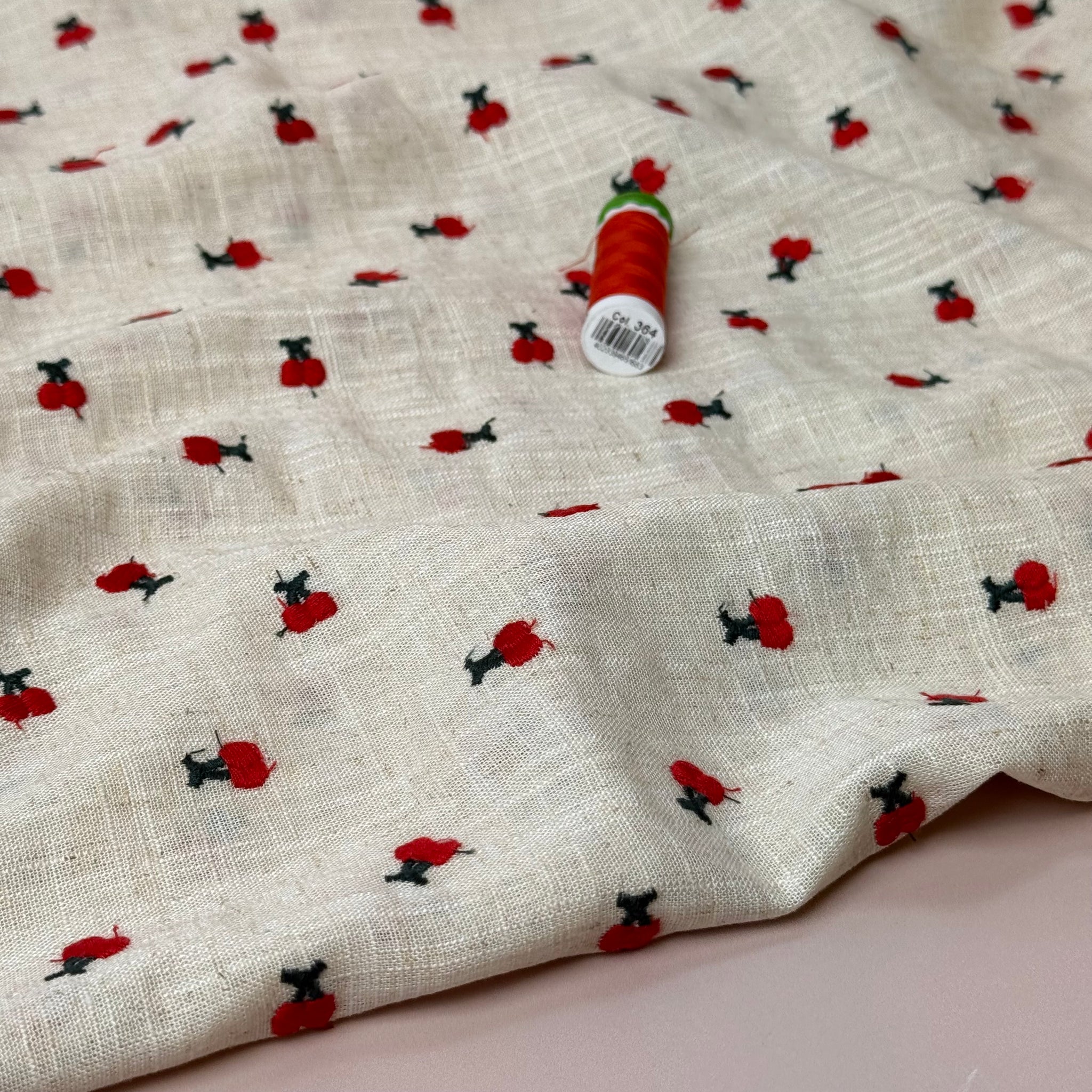 A beautiful and high quality viscose linen blend fabric with an embroidered cherry design in red and green on a natural beige background.