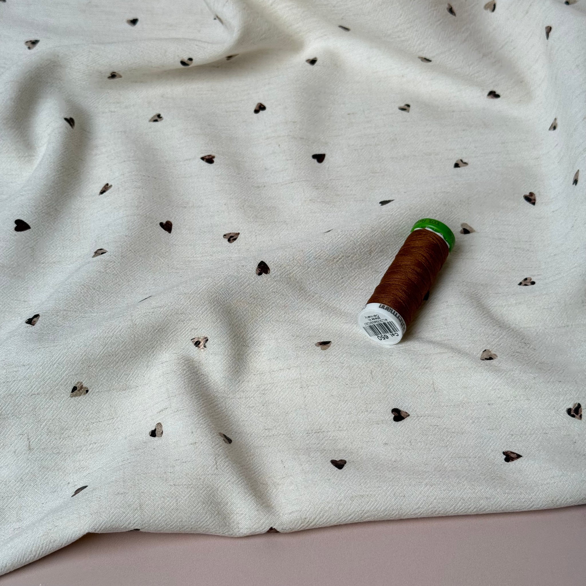 A beautiful and unique linen viscose blend fabric with small and cute animal print hearts on a natural background. The fabric itself is soft with ample drape, weight and slub texture, characteristic to linen. It will be a beautiful addition to your summer wardrobe.