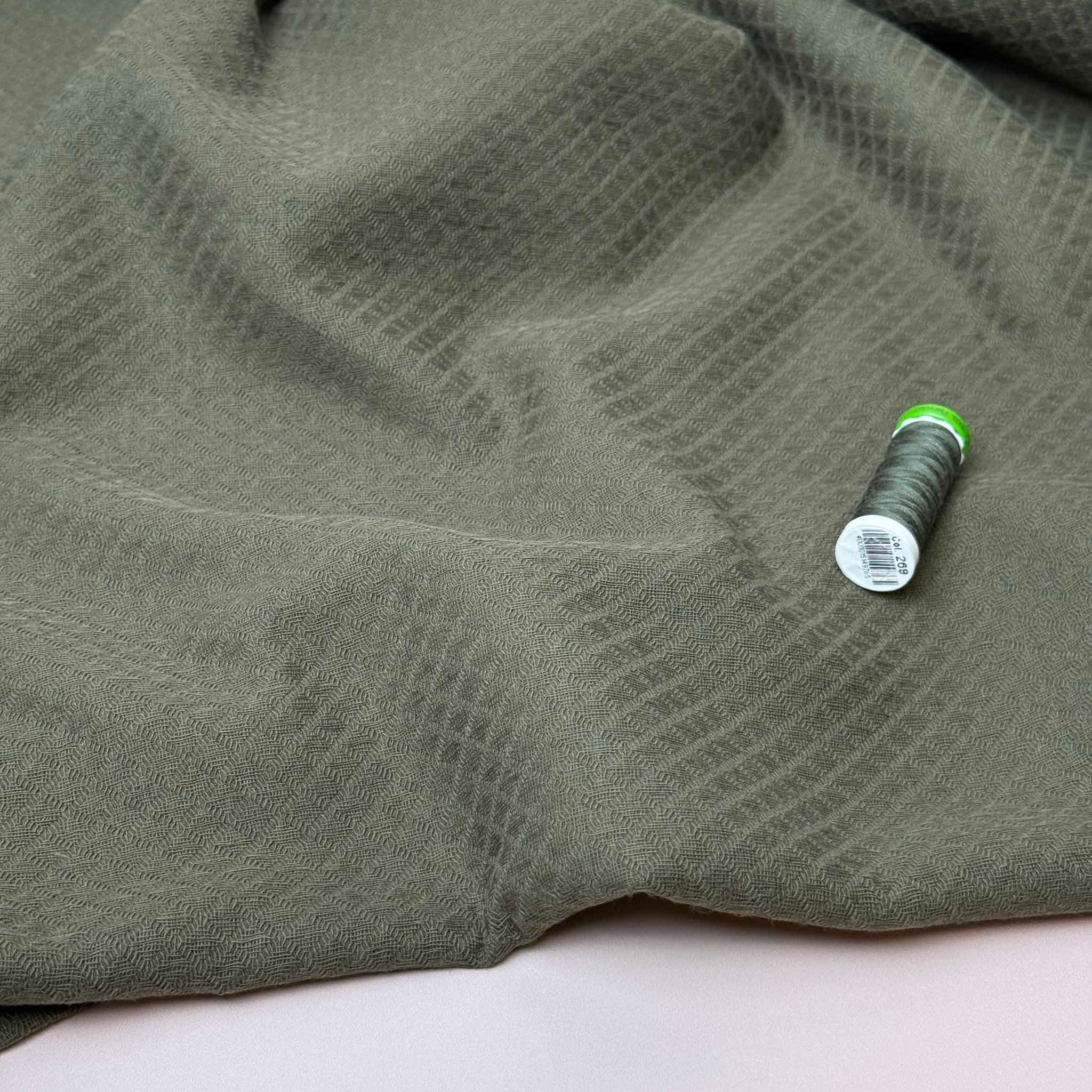 Unique and stunning pure cotton jacquard fabric with small diamond shapes woven into it. The special diamond jacquard weave gives this fabric a lovely structure, ideal for making summer jackets, tops, trousers, shorts and dresses. The fabric is yarn dyed in dark olive green colour.