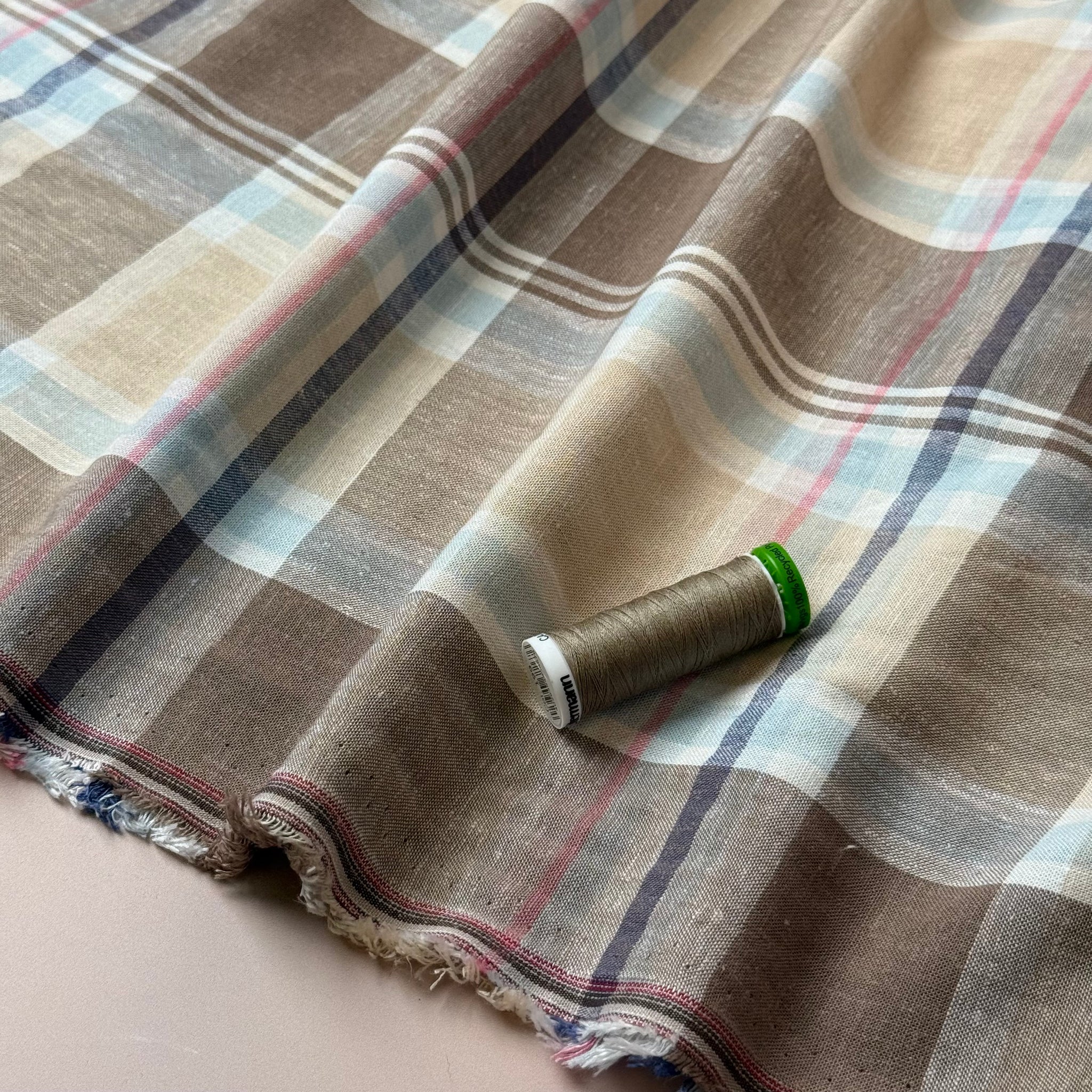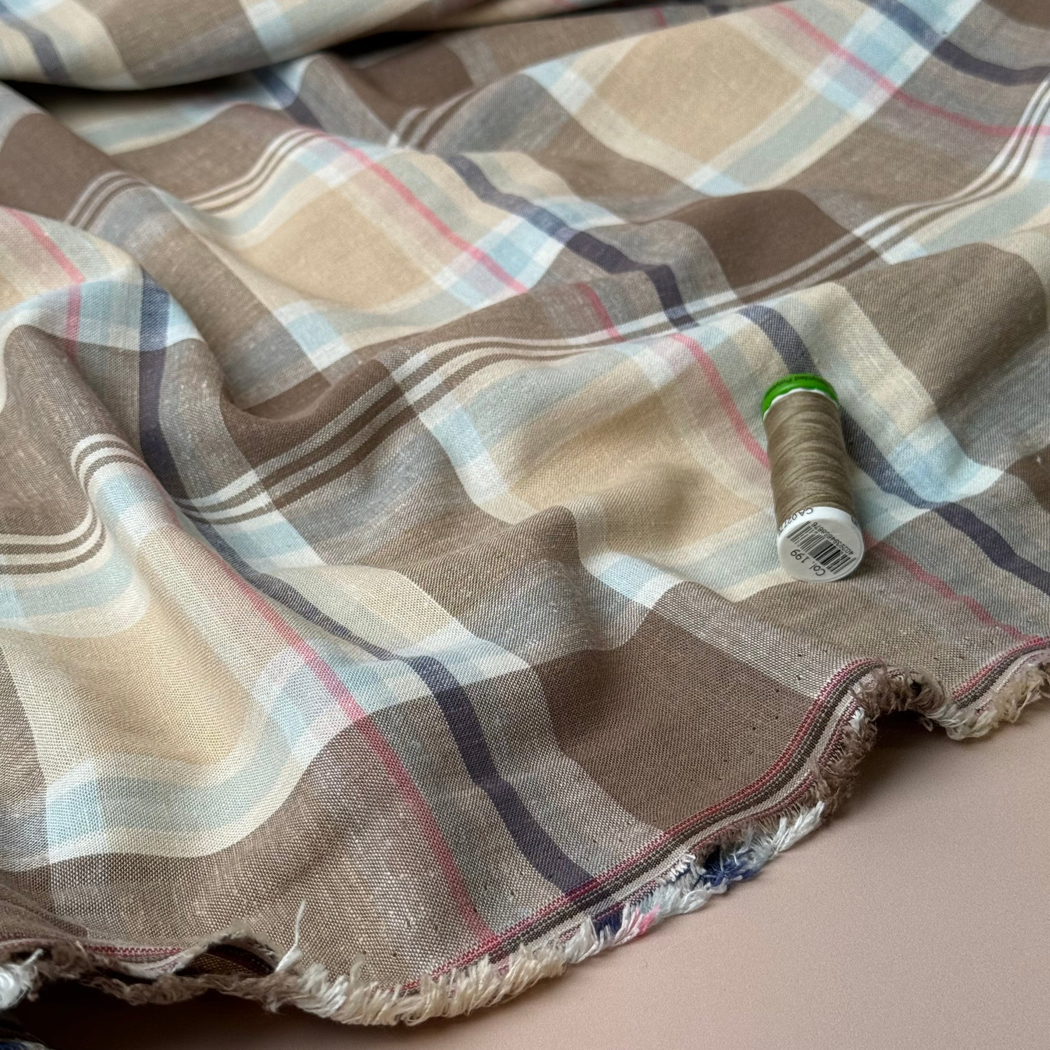 A beautiful and high quality viscose linen blend fabric with taupe and oatmeal checks and aqua blue and pink accents. This fabric is soft and easy to work with, ideal for dressmaking as it offers the best qualities of both fibres, the breathability of linen paired with the beautiful drape of viscose, a dream to sew with and to wear.