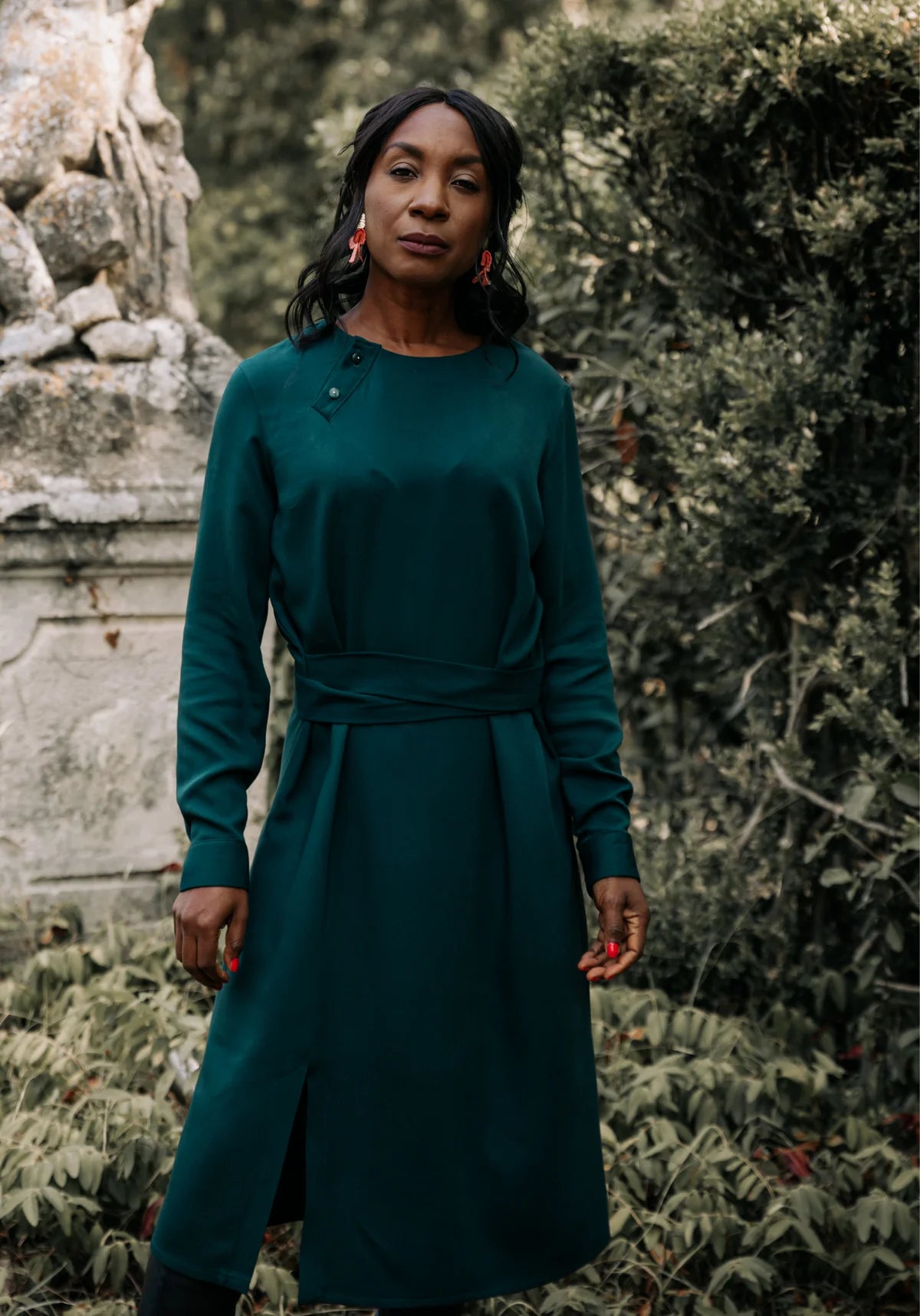 Discreetly elegant, a streamlined cut: beneath its apparent simplicity, the beautiful SOLIFLORE dress has a very assertive look: its straight cut is supported by a belt, and the front slit on the side feminises and rejuvenates the silhouette. Its signature: play on pleats on the back neckline, and a large collar that elevates without constricting the neck so you can hold your head high, embellished by a button placket that allows it to be worn closed or open and folded down.