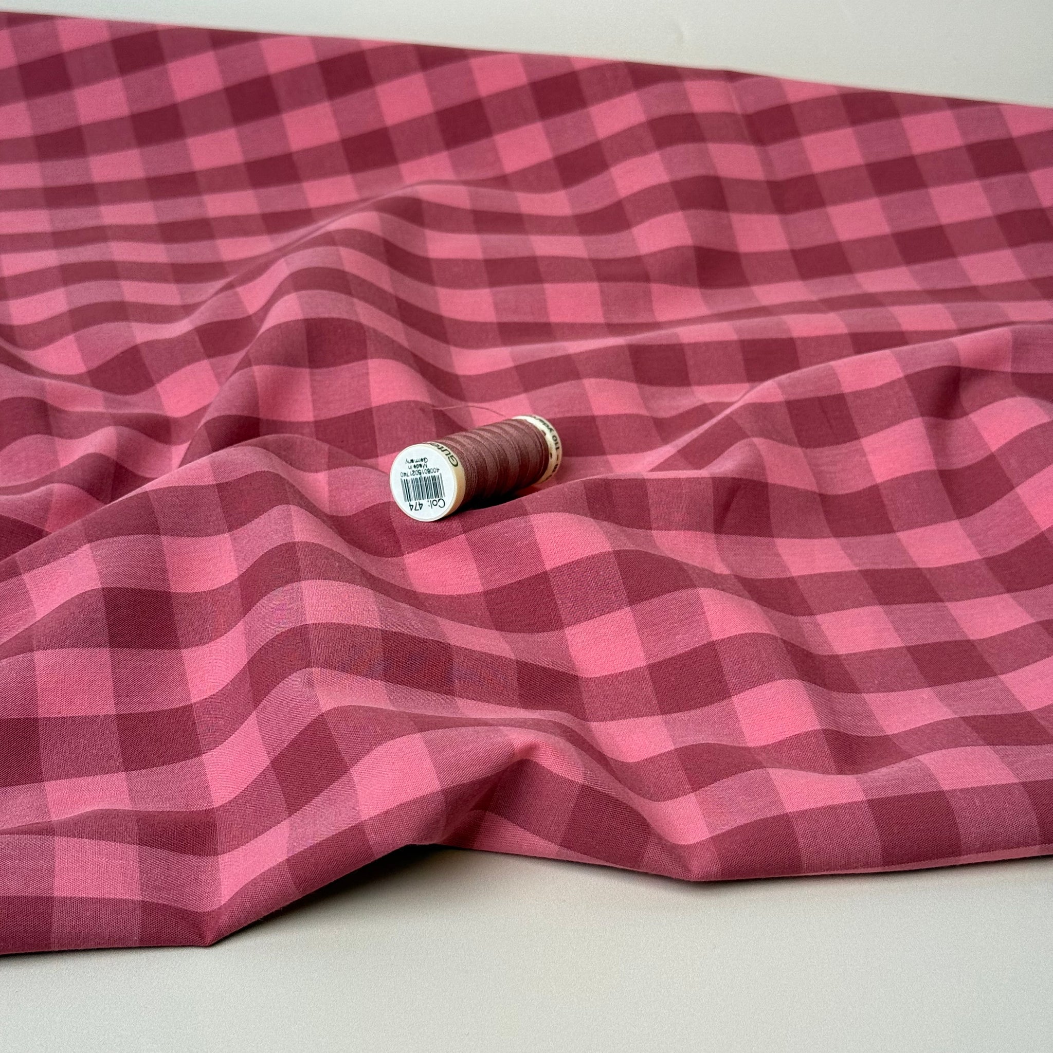 We are so pleased to be stocking this stunning, high quality, yarn dyed cotton fabric. It features a stunning gingham design in watermelon pink and burgundy.