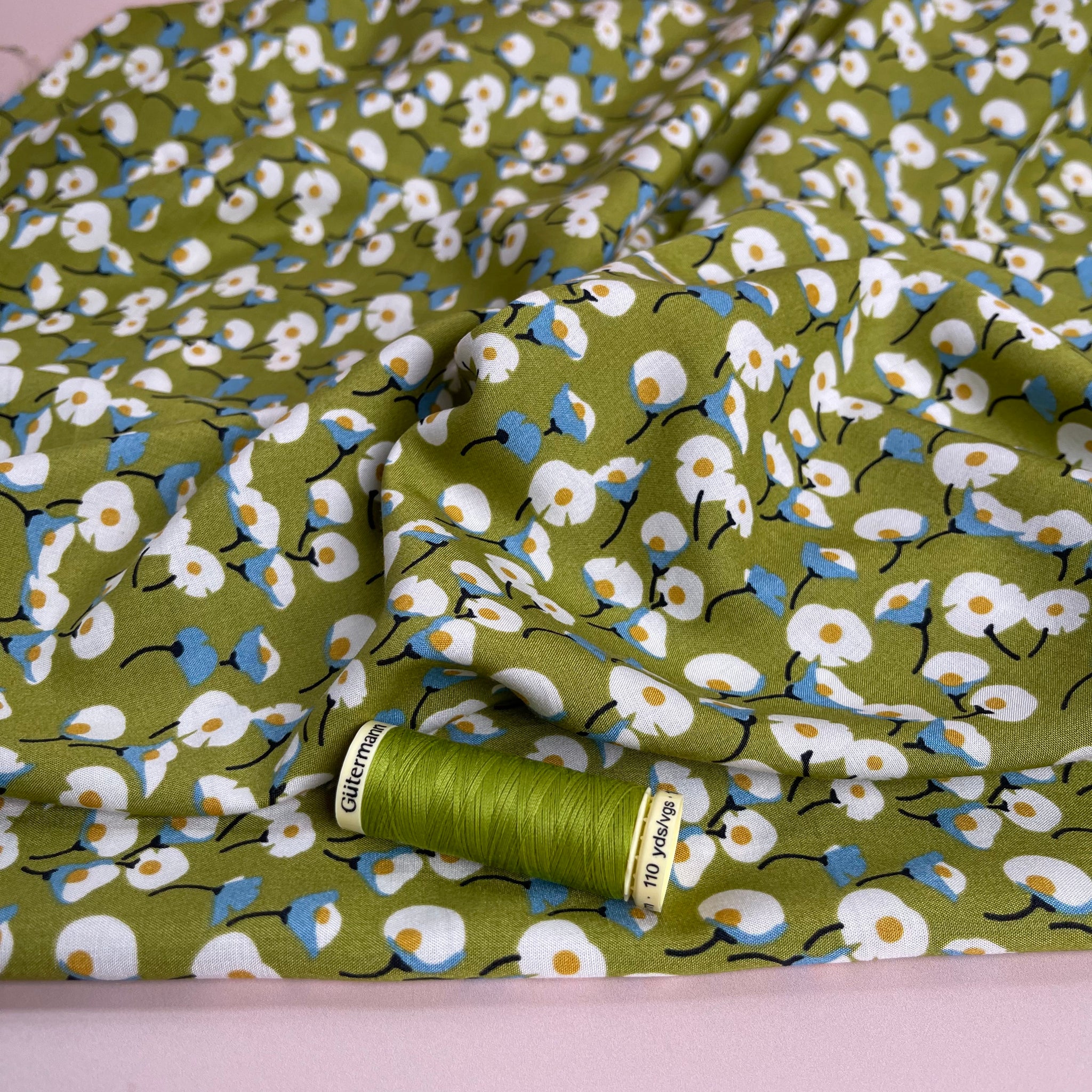 This romantic and beautiful viscose fabric offers off-white floral design on a grass green background. It is lightweight, silky and soft to touch with a beautiful drape.