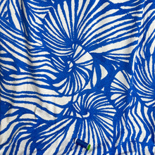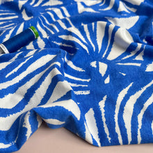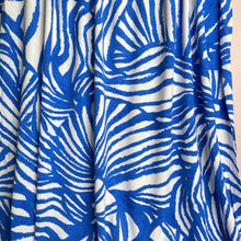 This high quality Ex-Designer deadstock fabric is a lightweight viscose jersey with ample stretch, bounce and good recovery. It is soft to touch and has beautiful weight and drape, featuring a white ammonite shell design on a blue background. It is perfect for making comfortable yet elegant wrap around dresses and tops as well as t-shirt and circle skirts.