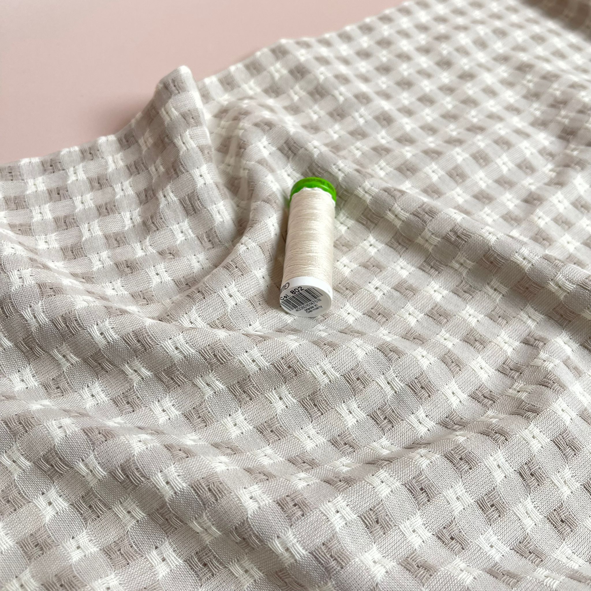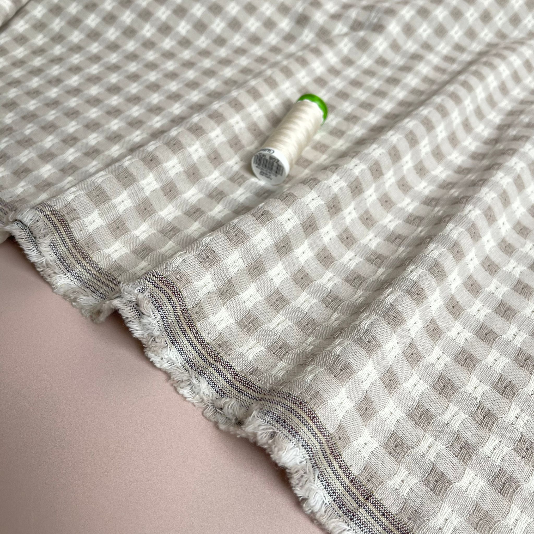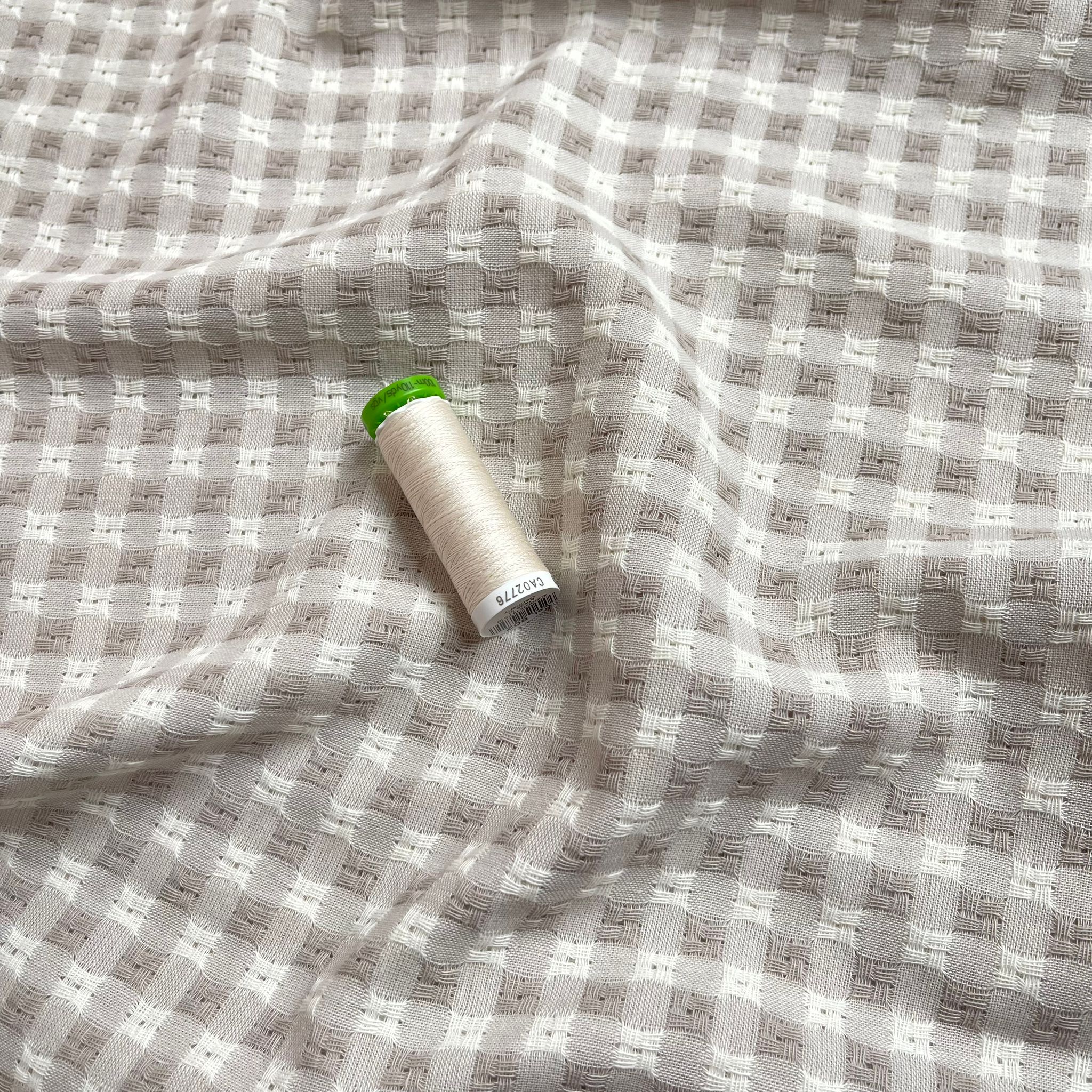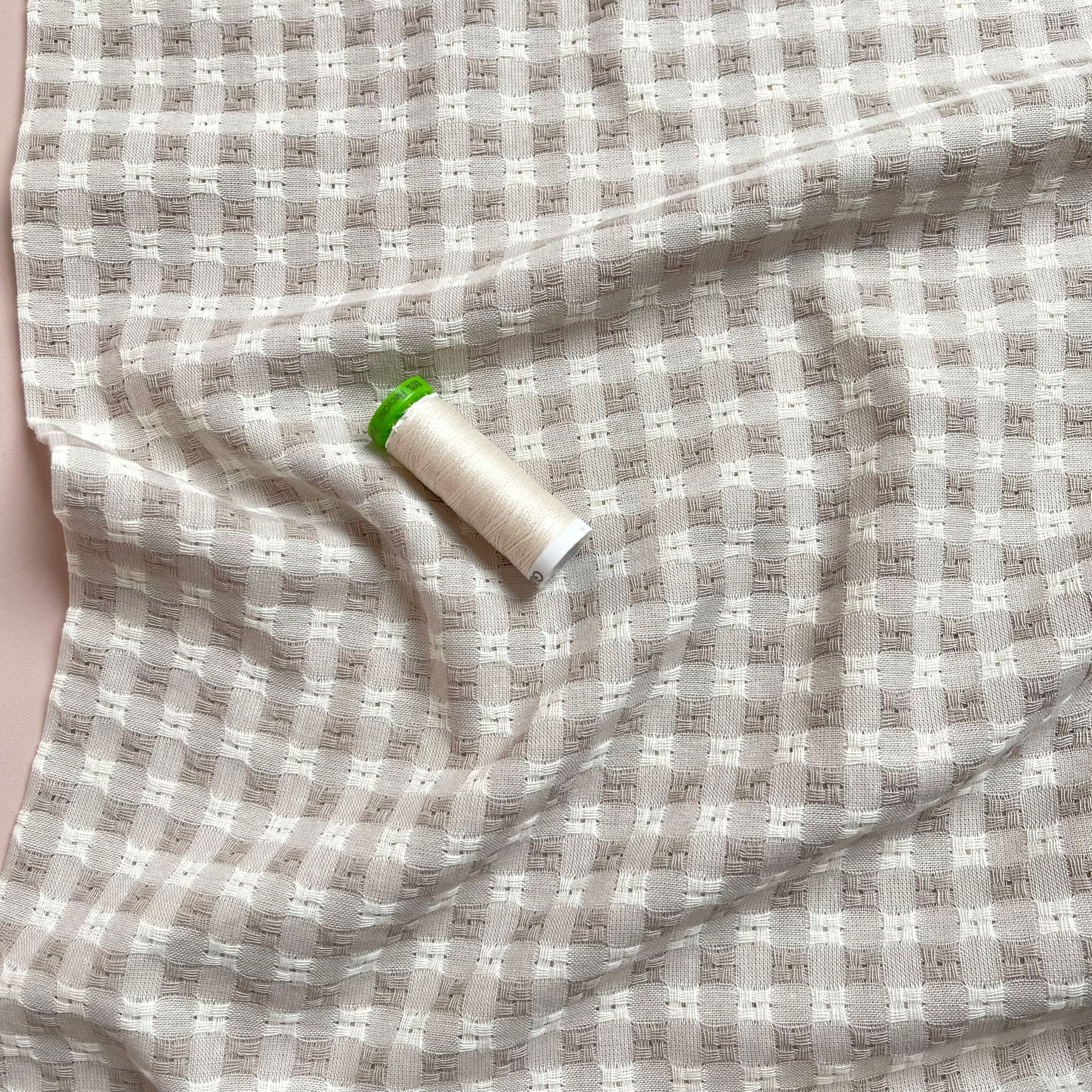 This yarn dyed cotton gingham fabric features small embroidered sections in alternating square, giving this fabric a lovely textured effect. This soft sandy beige and white gingham is perfect for spring and summer dresses, blouses, tops and skirts.
