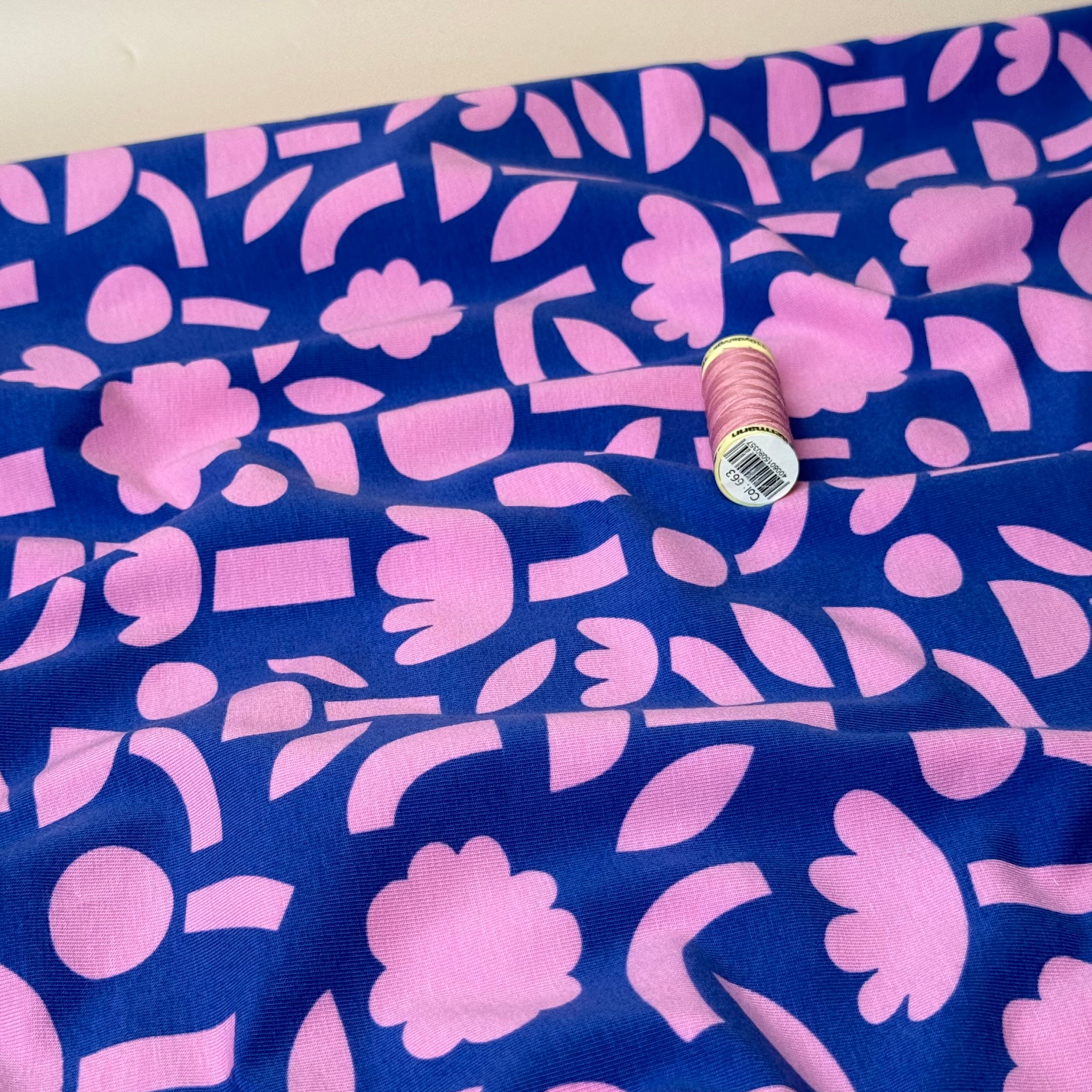 This softest cosy Organic Cotton Jersey features abstract shapes in pink on a purple background. This fabric is cosy and comfortable and will bring you a lot of joy when sewing and wearing.