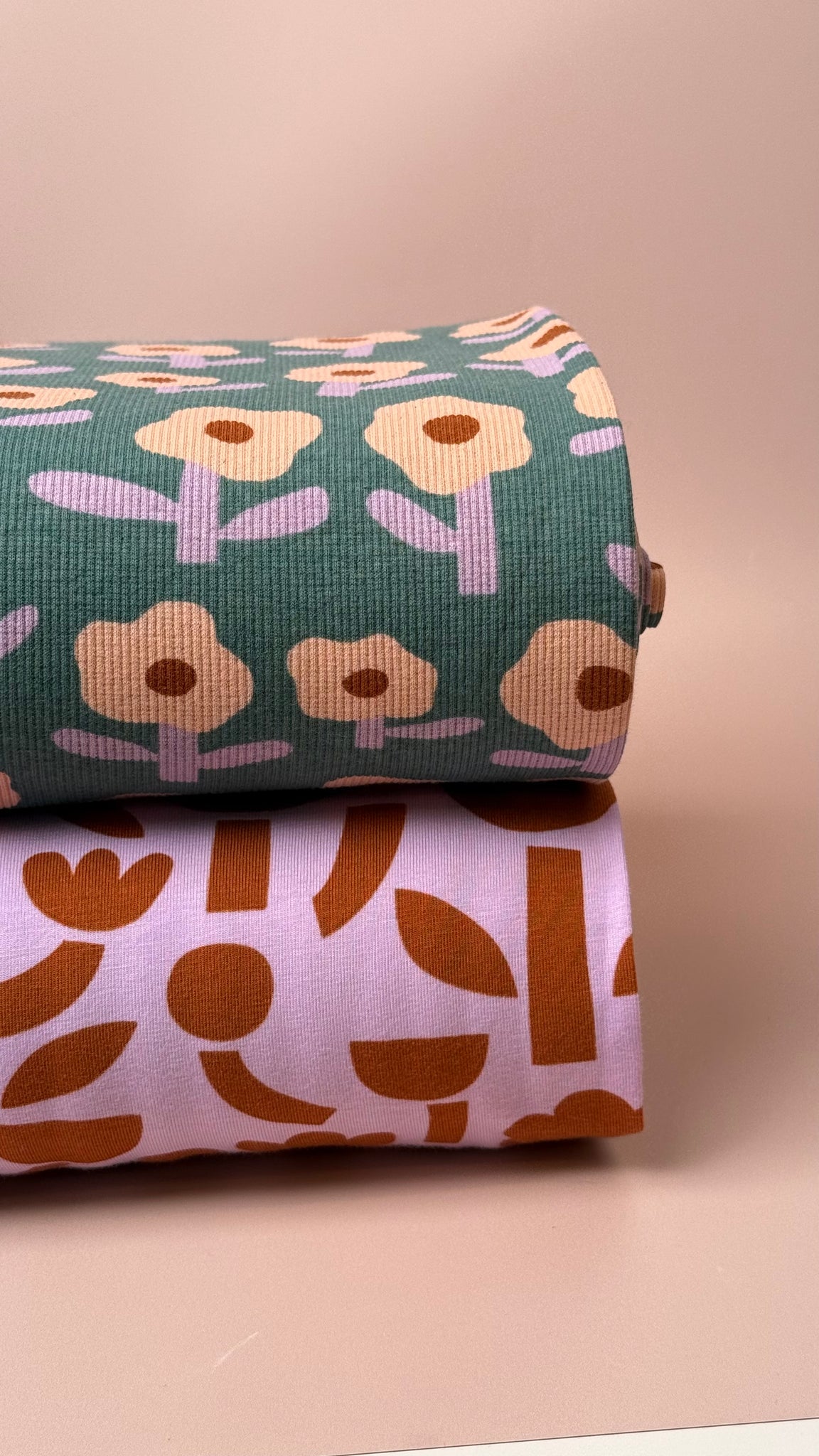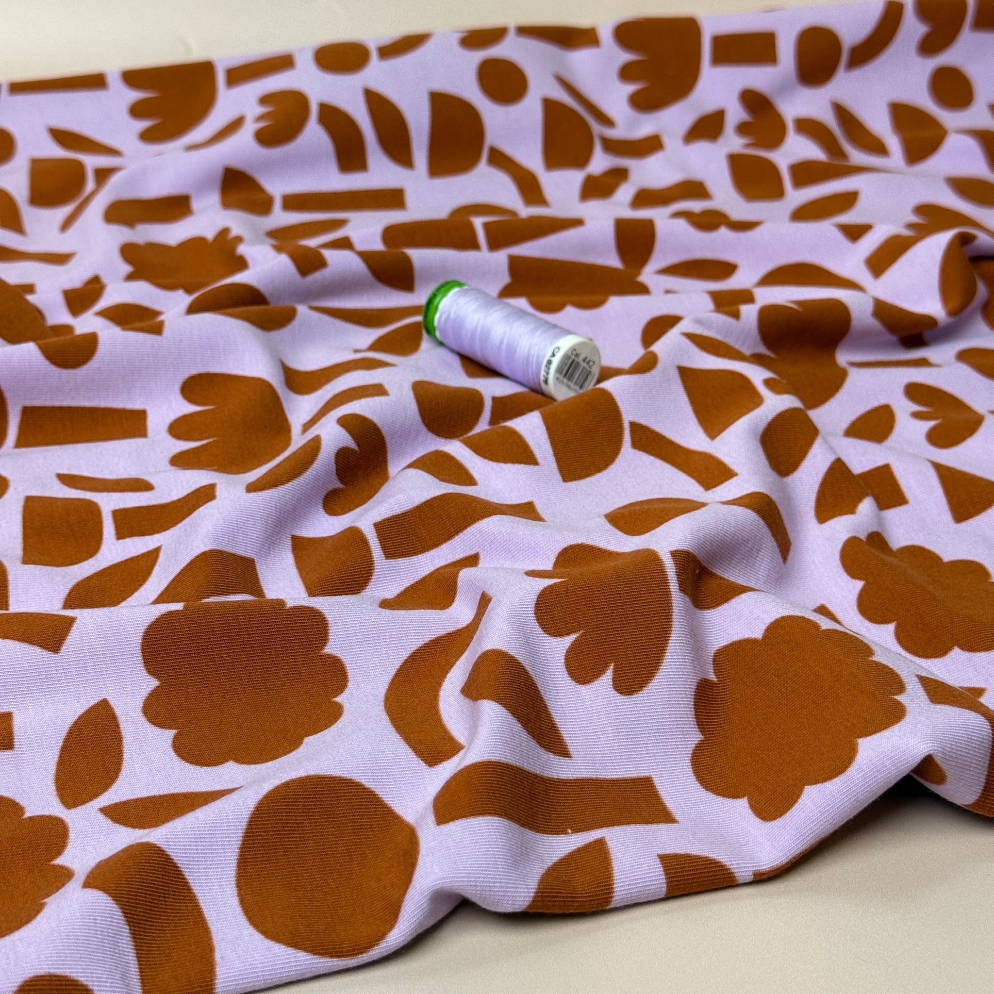 This softest cosy Organic Cotton Jersey features abstract shapes in copper on a lavender background. This fabric is cosy and comfortable and will bring you a lot of joy when sewing and wearing.